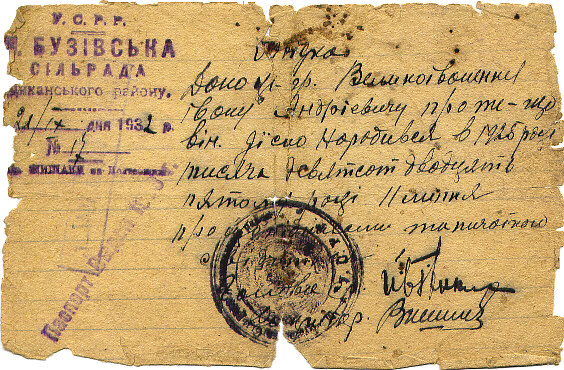 В наше время этот документ выглядит довольно непривычно. Удивляет, например, что в справке не указаны имена родителей. Видимо, тогда это не требовалось. Нет и данных о месте рождения (видимо, по умолчанию подразумевается, что это сама Малая Бузова). Тем не менее, это копия (отсканированное изображение) подлинного оригинала справки! (И в этом самая большая ее ценность). На первый взгляд, вызывает удивление дата выдачи справки - 21 сентября 1932 года. На самом деле, ничего удивительного в этом нет. Просто в течение какого-то времени (в данном случае - нескольких лет) в такой справке не было никакой необходимости. (Село!) А получена она непосредственно перед последовавшем в 1932 году отъездом семьи на Донбасс. А там документы были уже нужны для всех. Впоследствии настоящее место рождения (с.Цьовы Мало-Бузовского сельсовета) сына Марфы и Андрея никогда и нигде не указывалось. Так как Андрею долгие годы приходилось заметать все следы своей биографии этого периода. (Как и его сыну - данные о деде-"кулаке"). Сразу после войны Ивану было даже "восстановлено" такое свидетельство о рождении: |