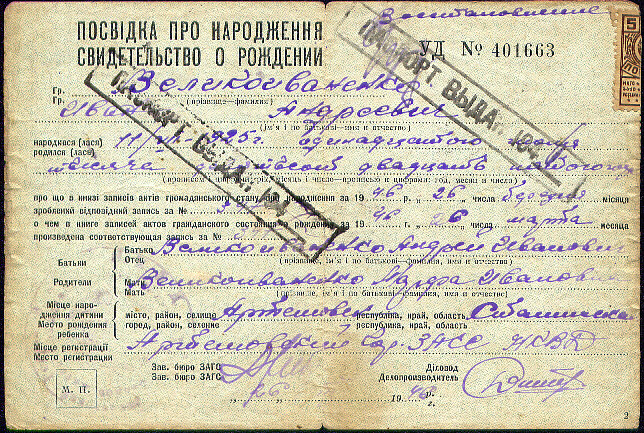 Здесь уже указаны имена родителей Ивана, но место его рождения (г.Артемовск) явно сфальсифицировано. А на основе этого документа, как показывают штампики, в 1947 году Ивану даже выдавался первый послевоенный паспорт. В дальнейшем это "свидетельство" больше никогда не использовалось. Во всех последующих документах Ивана местом его рождения всегда указывалась Матяшовка. Совершенно голословно, без подтверждающих документов. Только потому, что оттуда родом был его отец Андрей. Но каким образом это было оформлено и зачем, - так окончательно и не выяснено до сих пор. Скорее всего, чтобы еще немного изменить данные о своей личности и скрыть таким образом свое "сомнительное" социальное происхождение и "неблаговидное поведение" в годы войны (проживание в оккупации, штрафбат, да еще и немецкий плен). Чтобы раствориться среди многочисленных Великоиваненко из родного села отца (по данным одного из его старожилов, их там было около 40 семейств). А оформлено это "перемещение в пространстве" было, очевидно, со слов, а также, возможно, и на основании справки Малобузовского сельсовета (без указанного места рождения). Кстати, на этой справке ("довідці") тоже имеется штампик о выдаче паспорта, с датой, заканчивающейся на цифру 3. Предпоследняя цифра года на ней совершенно не видна, но она может быть легко вычислена (с точностью до одного года). В военном 1943 году паспорта на оккупированной территории не выдавались, а в 1963-м Иван Андреевич Великоиваненко был уже человеком с определенным социальным статусом (завучем средней школы), значит, уже имел полный комплект документов. Остается только одна возможная дата выдачи второго послевоенного паспорта - 1953 год. Но именно по первоначальной справке. Но пока до всего этого еще больше 20 лет... |