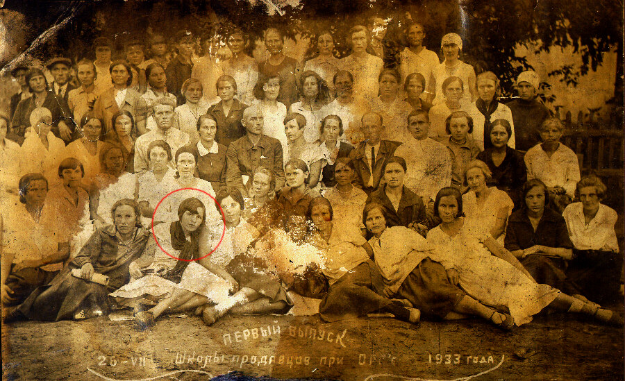 Первыми из семьи Великоиваненко, в широком ее понимании, спасаться от голода в Сталинскую область (так она тогда называлась) переехали брат Андрея Арсентий (его звали именно так, а не Арсений) и сестра Александра (Шура). Другой их брат, Даниил, и другая сестра, Анна, остались в селе... Арсентий и Шура устраивали свою жизнь в Донбассе по отдельности. Пробовали жить и работать на разных предприятиях и в разных городах - Сталино (теперь - Донецк), Макеевке (пригород Сталино), Синельниково, Артемовске (бывшем Бахмуте; самой большой достопримечательностью которого в те времена была знаменитая Бахмутская тюрьма). Шура вскоре вышла замуж за некоего Семена Роменского, местного жителя, как оказалось со временем, - неплохого мужика, хотя и не без уголовного прошлого. Родственники называли его Сеней. В свою очередь, Арсентий жениться не торопился. Вот к этому Арсентию, в Макеевку(?) или Артемовск, и прибыли едва унесшие ноги с голодающей тогда Полтавщины Андрей и Марфа со своим сыном Ваней. Оставив жену и сына на попечительство брата, Андрей тут же снова отправился в Новороссийск. Ведь там у него уже было рабочее место и определенное, хотя и крайне незначительное, положение в коллективе. А, главное, было больше надежды на то, что там его не станут искать органы НКВД, совсем недавно "разобравшиеся" с его тестем, и которые незадолго до того угрожали и самому Андрею, за его несговорчивость в вопросе коллективизации. Как проходил процесс адаптации Марфы и Вани в условиях донецких реалий, можно только догадываться. Но точно известно, что уже в середине 1933 года Марфа окончила краткосрочные курсы продавцов при ОРС'е и устроилась на работу продавцом магазина скобяных изделий (в нынешней лексике - хозтоваров). Судя по размеру группы (см. фото), обучение проходило в Макеевке или в самом Сталино. |