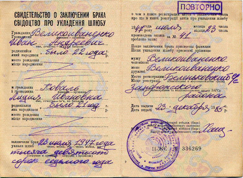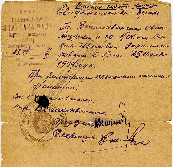 Из родителей на свадьбе присутствовала только мама невесты. Мать жениха не рассчитывала на благополучный исход сватовства, поэтому и не думала приезжать в Беленькую вместе с сыном. Его отец все еще служил в армии, а отец невесты только начинал отбывать свой срок заключения. Из-за этого всего мнения родителей (не говоря уже о благословении) в итоге никто и не спрашивал. (Правда, Анна Сидоровна дала таки свое формальное добро). В сельсовете Беленькой это бракосочетание было удостоверено следующим документом: |
