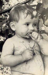 Примерно в 12 часов мы причалили в Беленькой, а через полчаса пришли уже в дом к тете Вере. Попали как раз к обеду. Все были очень обрадованы. И нашему приезду вообще, и тому, как я справился со всеми ночными пересадками. Саша в этот день запомнился мне переходящим из рук в руки, голопузеньким и сильно заевшимся вишнями (см. фото). В тот же день родители дали телеграмму в Миргород о том, что мы благополучно добрались. |