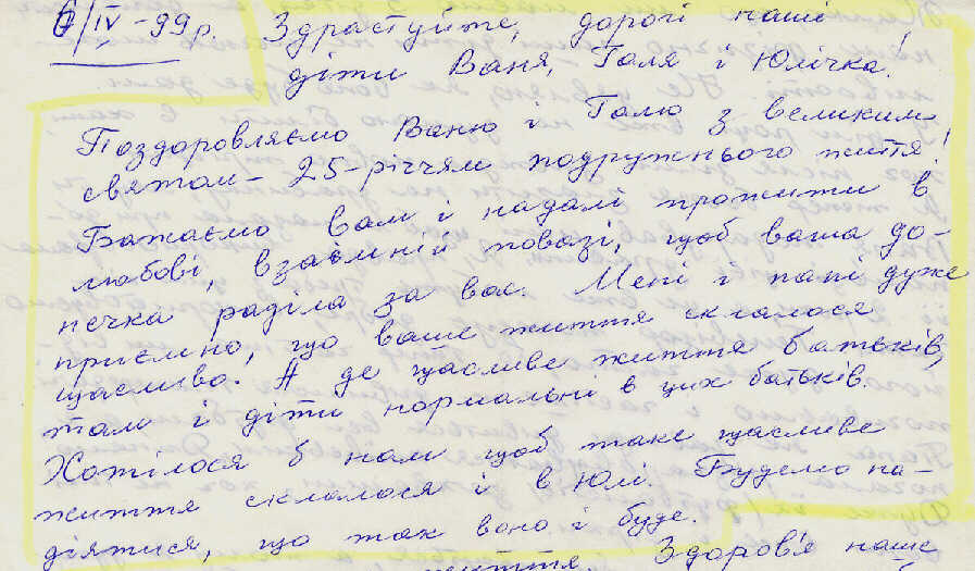 В Вену мы добирались поездом (до Ужгорода) и автобусом (через Словакию), обратно - электричкой(!) до Братиславы, и далее до Киева - поездом. Интереснейшие подробности пересечения границ и экскурсий здесь приходится опустить. Финансовая сторона поездки более, чем на 50%, была обеспечена Юлей. Благодаря своему служебному положению, она смогла обеспечить льготные условия проживания и транспортных расходов, а также полностью покрыла все затраты на себя лично. * * * * * * * Примерно за неделю до нашего юбилея мы получили так долго ожидавшееся поздравление родителей с нашим бракосочетанием: |