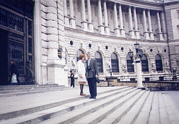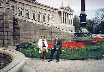 Весной 1999 года исполнялось 25-летие нашего с Галей бракосочетания. Я оформил заграничные паспорта, Юля - визы (минут за 15), и мы втроем (без Олега) отправились праздновать нашу "серебряную" свадьбу в Австрию. Пробыли в Вене восемь незабываемых дней. Это особая история, подробно описывать которую в настоящем повествовании нет никакой возможности. Главными объектами-ориентирами этой поездки, с которыми мы соприкоснулись непосредственно, стали королевский ("кайзеровский") дворец Хофбург, загородняя резиденция кайзера Шёнбрунн, дворец Бельведер, городская ратуша, университет, парламент, здание государственной Оперы, собор святого Штефана, зоологический музей, парк "Пратер", городок ООН с расположенным в нем комплексом зданий МАГАТЭ, и невероятный по своим размерам и функциональности (даже в представлениях сегодняшнего дня) торговый комплекс SCS (Shoping City Sud). И другие. Проживали мы в небольшой частной гостинице, практически в центре города. Пользовались всеми видами общественного транспорта (метро, трамвай, автобус, электричка; троллейбусного движения в Вене нет), приобретя для этого универсальные проездные билеты. Питались в самых разных местах (и гостинице, и в городе), не голодали. |