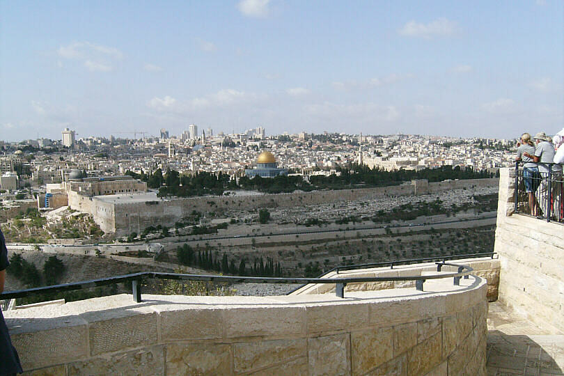 Стык южной и восточной стен города. Золотой купол - мечеть Омара. Левее вдали (голуб.купол) - Храм ГГ. Посередине стены - Золотые ворота