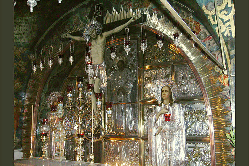 Иконостас храма на вершине Голгофы. Крест установлен точно на месте распятия Иисуса