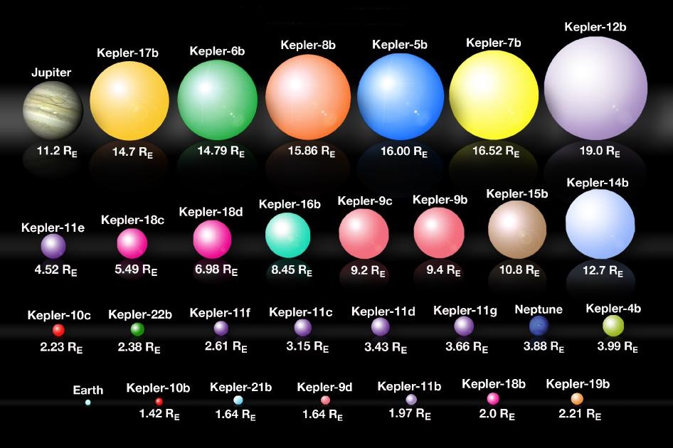 "Кеплер" блестяще справился с поставленной перед ним задачей в условиях реального космоса. Уже в первые два года он открыл большое количество весьма крупных (по сравнению с Землей) экзо-планет. (Что и не удивительно, ведь крупные планеты заметнее). Часть из них показана на следующем рисунке (цвета условные). Земля (Earth) и Юпитер (Jupiter) представлены для сравнения.