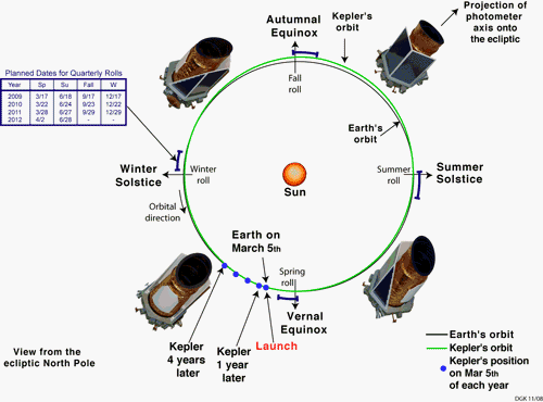 В 2009-м запущен принципиально новый космический телескоп «Кеплер» ( Kepler). Для исключения его периодических попаданий в зону тени Земли, он был сразу размещен на гелиоцентрической орбите (пролегающей вокруг Солнца), подобной орбите Земли, но с периодом обращения 372 дня (ежегодное несущественное отставание примерно на 5 дней). На рисунке внизу обозначена зеленым цветом.
