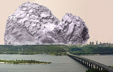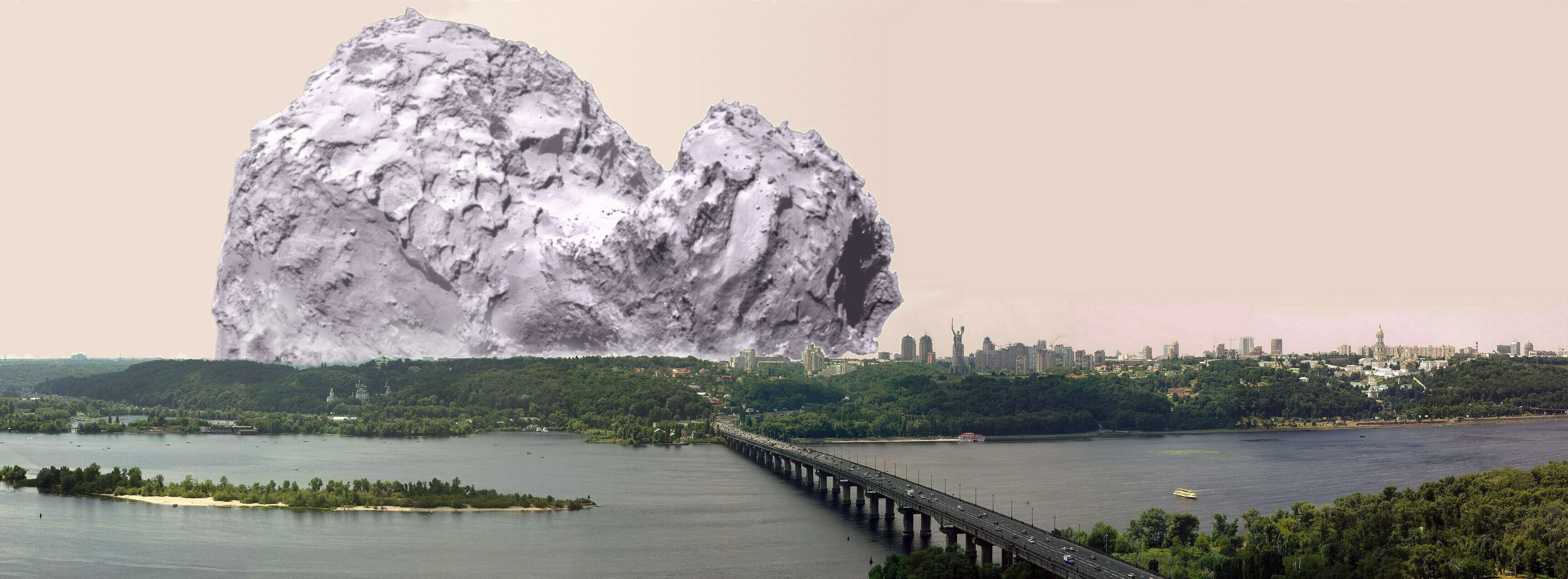 Так выглядело бы с левого берега Днепра в Киеве ядро кометы 67Р/CG, если бы оно приземлилось на Теремках - Жулянах За