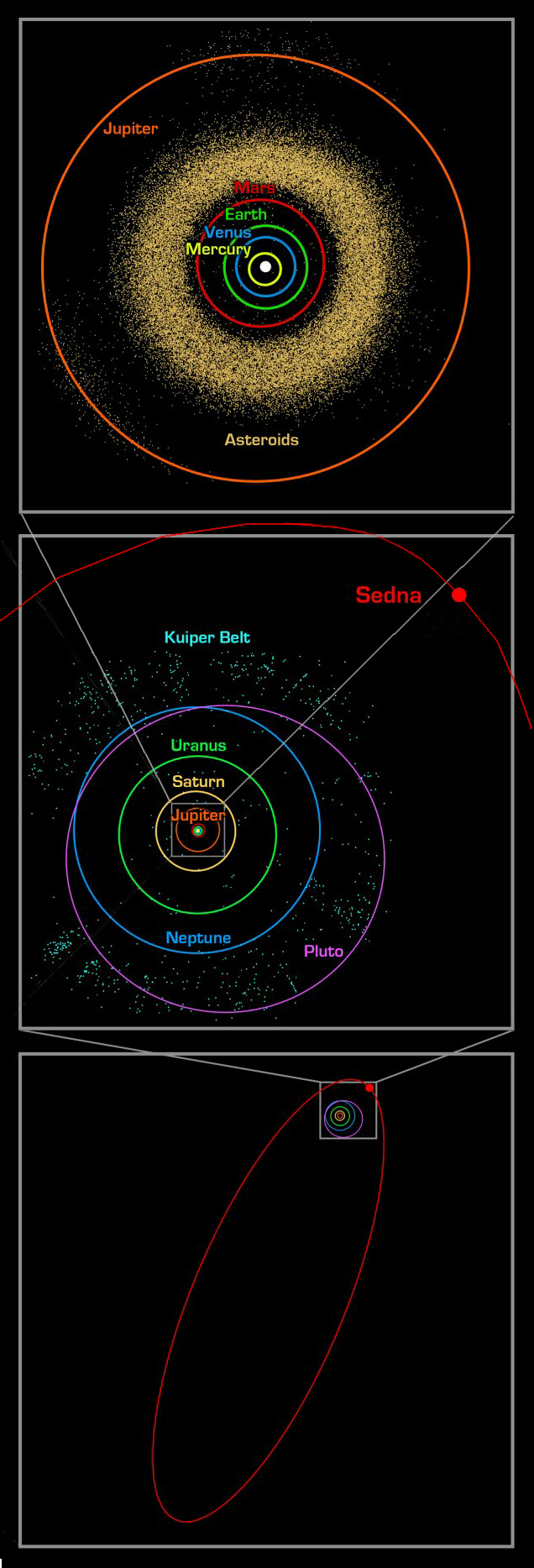 Еще в 2003 году за орбитой Нептуна было открыто еще одно интересное космическое тело, до сих пор не имеющее официального статуса планеты (хотя бы карликовой) - объект 2003 VB12 90377 Sedna (или просто Седна). Однако, многие астрономы считают ее именно таковой. Ведь именно ее присутствие объяснило определенные изменения в движении системы Плутон/ Харон. Некоторое представление о ее орбите дает следующая последовательность рисунков, каждый из которых имеет масштаб, почти в 10 раз более общий (мелкий), чем предыдущий (точно - в 9,25 раза):
