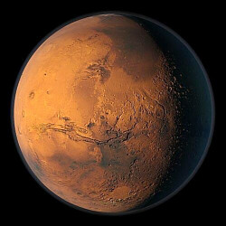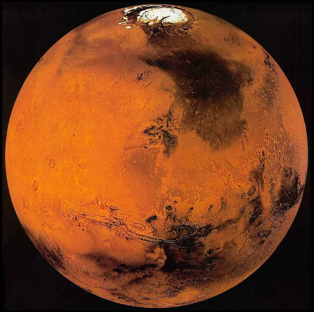 Не считая Земли, в Солнечной системе есть только одна планета, имеющая климатические условия, подходящие (да, по мнению автора данного сайта, несмотря ни на что, - подходящие!) для самообразования и существования на ней простейших форм жизни. Этой планетой является Марс (см. фото справа). Красноватый его цвет определяется большим количеством соединений железа, входящих состав почвы планеты. Венеру, имеющую температуру на поверхности в несколько сот градусов и давление атмосферы (содержащей в своем составе и ядовитые газы) в несколько сот атмосфер, в качестве еще одной претендентки на такую роль пока рассматривать трудно. Возможно, через несколько миллиардов лет, когда Солнце начнет затухать... |
