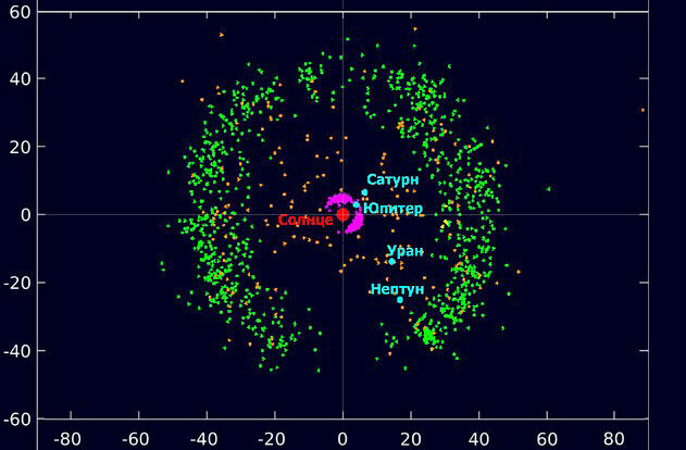 Пояс Койпера. Зеленым цветом показаны главные места сосредоточения объектов. Градации шкалы - в астрономических единицах Безусловно, имеется в этом поясе и гораздо большее количество более мелких, не поддающихся никакому наблюдению объектов, являющихся остатками материалов в процессе формирования Солнечной системы. Состоят эти объекты в основном из льдов (воды, аммиака и/или метана). Орбиты объектов пояса Койпера имеют размер от 30 до 55 астрономических единиц (1 а.о. - среднее расстояние от Солнца до Земли, почти 150 млн.км). Многие из них являются групповыми образованиями (в т.ч., двойными карликовыми планетами) и даже имеют спутники. Чем дальше находятся такие объекты от Солнца, тем чаще и больше плоскости их орбит отклоняются от эклиптики (плоскости орбиты Земли, с которой примерно совпадают и плоскости вращения всех других, "истинных" планет Солнечной системы). От классических планет, движущихся по орбитам, не слишком отличающимся от окружностей, все объекты пояса Койпера отличаются значительным эксцентриситетом (вытянутостью) орбит. Подобную орбиту имеет и рассматриваемый нами сейчас Плутон. К тому же, ее плоскость заметно не совпадает с эклиптикой (отклонение превышает 17 градусов). В связи