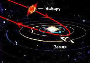 Почему Нибиру на рисунке такая огромная и почему она охвачена пламенем - не ясно. Зато ясно, что ее орбита не имеет (и не может иметь) ничего общего с орбитой Земли. Ведь перигелий Нибиру гораздо больше, чем радиус почти круговой орбиты Земли (он находится даже за орбитой Юпитера, 5-й от Солнца планеты). А перигелий, просто по определению, - самое короткое расстояние орбиты до Солнца, поэтому никакого "еще более короткого" не может быть в принципе. Поэтому пересечение орбит Нибиру и Земли (и даже Нибиру и Юпитера) исключено. Ко всему прочему, как видно из рисунка, плоскость орбиты гипотетической Нибиру довольно сильно отклонена от примерно совпадающих плоскостей орбит других планет Солнечной системы, что делает практически невозможным ее пересечение с орбитами любых их них, даже внешних по отношению к Юпитеру (Сатурна, Урана и Нептуна). Правда, чисто теоретически это не исключает перелет с Нибиру на Землю и обратно ее предполагаемых обитателей - аннунаков на космическом корабле. Только вот как на нем транспортировать тысячи (или миллионы?) тонн золота (якобы им совершенно необходимого)? Ожидавшееся "прибытие" Нибиру в свой перигелий ("планировавшееся" на декабрь 2012 года) у некоторых людей почему-то ассоциирова-лось с возможным концом света.