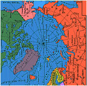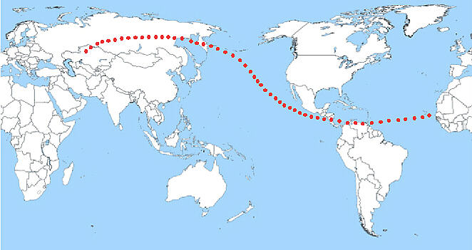 Разница периодов обращения Земли и Апофиса вокруг Солнца составляет 365 - 323 = 42 земных суток; поэтому периодичность сближений 365 : 42 = 8,69 лет Предкритическим станет сближение 2029 года, после которого орбита Апофиса за счет гравитации Земли изменится таким образом, что уже в 2036 году (или в любом последующем, с измененной частотой 7 лет) станет возможным (а при попадании в зазор т.н. "пространственной защелки" - просто неизбежным) их прямое столкновение. Вероятность того, что это событие произойдет уже в 2036 году, пока оценивается, как крайне незначительная, и составляет всего 2,2-2,5.10е-5, (но это гораздо больше, чем предсказывали все предыдущие оценочные расчеты). После фактического изменения орбиты астероида в 2029-м она, видимо, будет окончательно скорректирована и, скорее всего, в гораздо большую сторону. Если столкновение случится уже в 2036 году, то положение Земли относительно собственной оси вращения при этом будет таким, что место возможного падения астероида окажется в одной из точек, отмеченной красным цветом на следующей карте: