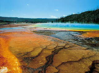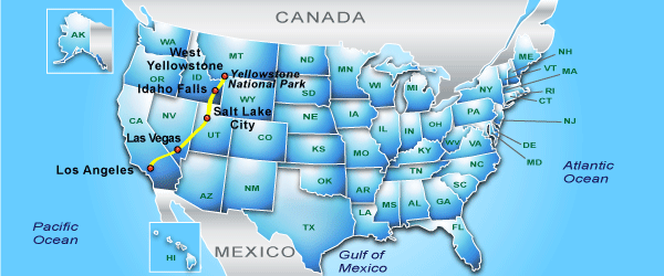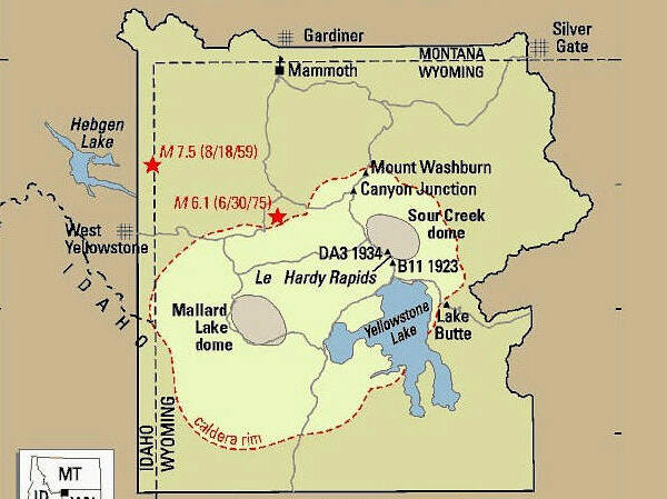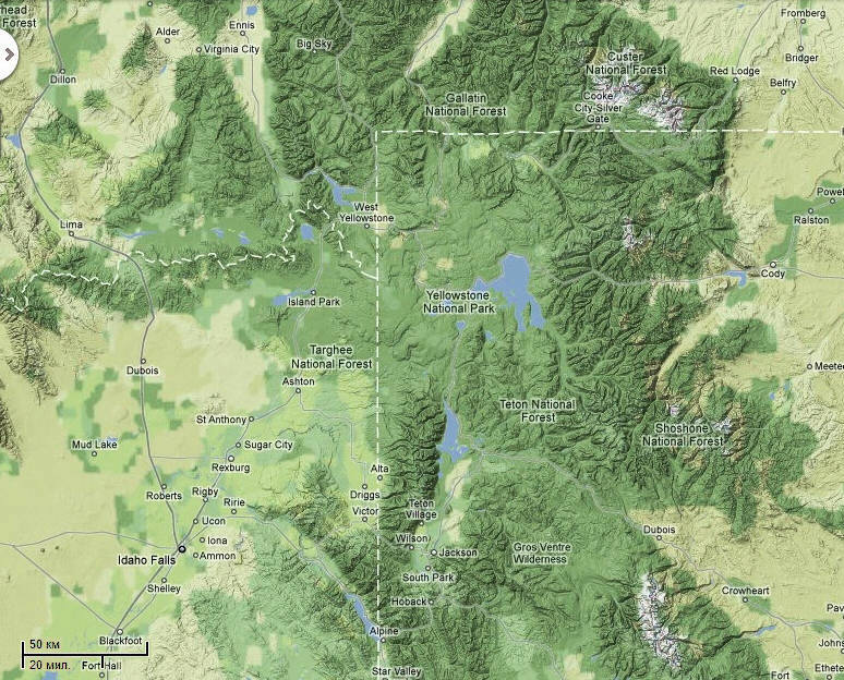 И только с началом космических исследований Земли стало понятно, что Йеллоусоунское плато и окружающие его хребты и склоны Скалистых гор представляют из себя не что иное, как Йелоустоунскую кальдеру - жерло дремлющего супервулкана, самого большого на нашей планете (белым пунктиром на карте обозначены границы штатов).