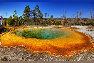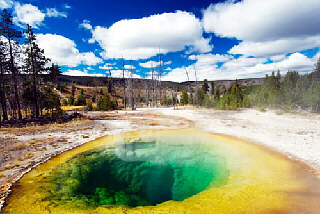Геологическими методами установлено, что кальдера образовалась в результате последнего катастрофического извержения 640 тысяч лет назад. Эта цифра великолепно соответствует времени гибели подавляющего числа животных эпохи динозавров, что, скорее всего, свидетельствует об имевшем место полном засорении атмосферы Земли вулканическим пеплом в момент извержения и последующем наступлении резкого похолодания климата (по типу "астероидной" или "ядерной" зимы). Менее масштабные, но, конечно, тоже огромные извержения в Йеллоустоуне происходили 160 тыс. и 70 тыс.лет назад. У кальдеры нет конусоподобной вершины, это просто своеобразный огромный провал, в момент извержения заполненный только кипящей лавой, переливающейся через край. Одновременно кальдера выплевывает в атмосферу неисчислимое количество брызг этой лавы (на лету превращающихся в камни), пара, газов и пепла. Предполагается, что при повторном катастрофическом извержении в Йеллоустоуне вулканический пепел сможет покрыть всю поверхность Земли сплошным слоем толщиной 8 см! Если такой выброс случится, на всей планете на несколько лет наступит «ядерная зима» - температура повсеместно понизится на 15-20 градусов. Ко всему прочему, вулканический пепел довольно токсичен. Но еще быстрее, чем от пепла и последующего холода, при таком извержении люди будут умирать от отравления сероводородом, концентрация которого в воздухе превысит все мыслимые пределы. Непосредственно от раскаленных продуктов извержения и связанных с ними пожаров пострадает (и погибнет) население на расстоянии от нескольких сот до 1000 км от супервулкана (в зависимости от ветровой обстановки в момент извержения). * * * * * * * В 2003 году в данном районе зарегистрирована повышенная активность и более высокая температура воды некоторых гейзеров бассейна по сравнению с обычной. Несколько гейзеров стали столь горячими, что испускали пар вместо воды. В 2006 году было обнаружено, что почва сразу в двух местах в парке поднимается со скоростью 4-6 сантиметров в год (по другим данным - гораздо быстрее). В регионе постоянно протекают мелкие землетрясения. Однако, эксперты настаивают на том, что в ближайшее время повышенного риска извержения нет.