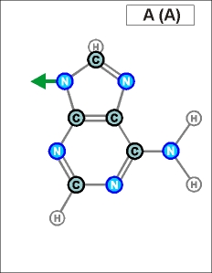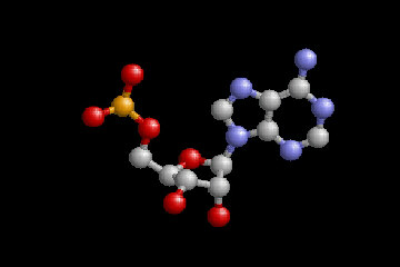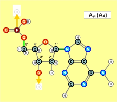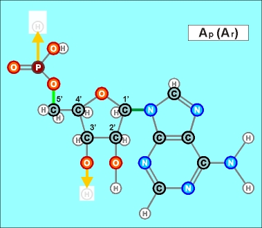 Чтобы получить более правильное представление о пространственном устройстве молекл нуклеотидов, а также для переключения внимания читателей из сферы умственной деятельности в область эстетического(!) восприятия учебного материала, ознакомимся с несколькими моментальными "снимками", сделанными в специализированных химических программах построения объемных (да еще и движущихся!) моделей молекулярных соединений. В качестве примера выбран нуклеотид аденин А_r (А_р). Разные его модели выстроены по разным методикам и с учетом разных приоритетов. Ниже представлена лишь незначительная часть результатов при различных подходах к их построениям. Атомы водорода, размещенные вплотную к тяжелым ядрам, образующим скелеты молекул, на рисунках условно не показаны. Цвета остальных атомов в моделях, выстроенных в разных компьютерных программах, совпадают не всегда, но принципиально это ничего не меняет.