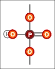 Радикал - не просто весомо звучащее слово. Это нечто, способное действовать чрезвычайно энергично (даже и в применении к общественной жизни). В данном конкретном случае такая способность вызвана двумя свободными валентностями, по одной на двух атомах кислорода. При наличии в окружающей среде каких либо атомов, они быстро присоединяются к свободным отросткам радикала. Обычно это бывают атомы водорода (гидрогена), наиболее распространенного во Вселенной химического элемента. И вместе с этими атомами этот радикал обычно и изображают. (Хотя после этого он, по существу, перестает быть радикалом в полном смысле этого слова). Большинство исследователей относят этот радикал к одному из "первокирпичиков" жизни. Невозможно спорить о важности этой структуры для возникновения и последующего развития жизни. Но автор данного сайта, проанализировав все имеющиеся в его распоряжении данные, пришел к выводу, что первоначальный вид подобного фосфорного соединения (по сути дела - одного из вариантов фосфорной кислоты), когда до органического изобилия соединений было еще очень далеко, был иным, а именно - таким (Рис. 1.2):
