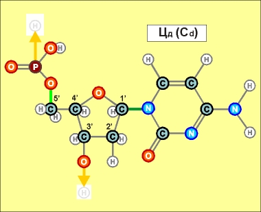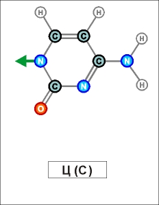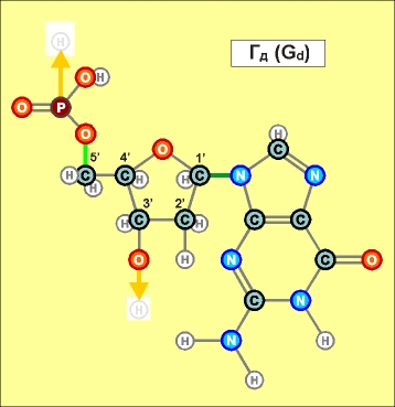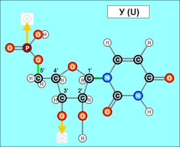 Пришло время указать, что все радикалы (и их соединения), представленные на рисунках с голубым фоном (имеющие по дополнительному атому кислорода/оксигена у второго справа атома углерода/карбона в пятиугольниках/пентозах), вступают в реакции и образуют устойчивые связи только между собой и с универсальными основаниями, показанными на рисунках с белым фоном. И они сами, и образованные ими нуклеотдиды относятся к т.н. соединениям урацилового ряда - по названию самого первого (и самого относительно простого) азотистого основания этой группы - урацила (сокращенно У или U). Аналогично, все радикалы и их соединения, представленные на этом сайте на рисунках с желтым (и белым) фоном, вступают в устойчивые постоянные связи только в пределах своей группы. В их карбоновой сердцевине/пентазе отсутствует один "необязательный" атом кислорода, из-за чего сам этот радикал и все его последующие соединения в своих полных наименованиях и имеют начало "дезокси" ("обескисленные"). Из-за этой "мелочи" существенно меняется структура электронного облака в нижней части любого нуклеотида этого ряда, из-за чего становятся невозможными их прочные соединения с продуктами противоположного, урацилового ряда. Нуклеотиды являются уже довольно сложными химическими соединениями, поэтому и их полные названия довольно сложны. К тому же, все они имеются в нескольких различных вариантах. (Часть из них приведена далее, в таблице "Доп. информация"). Посетителям данного сайта такое запоминать совершенно не нужно. Поэтому, чтобы просто понимать, как идут дальнейшие процессы, нуклеотиды условно просто обозначаются первыми буквами образовавших их оснований У(U), Ц(C), А(A), Г(G), Т(T), Ц(C), А(A), Г(G). При этом иногда их выделяют цветом или индексами r или d (чтобы отнести их к тому или иному ряду, особенно, когда названия совпадают). Основополагающим нуклеотидом этого ряда является тимин (Т). По первой букве приставки "дезокси" все они (кроме самого тимина) и их карбонатный радикал обозначаются, в случае необходимости, индексом d .