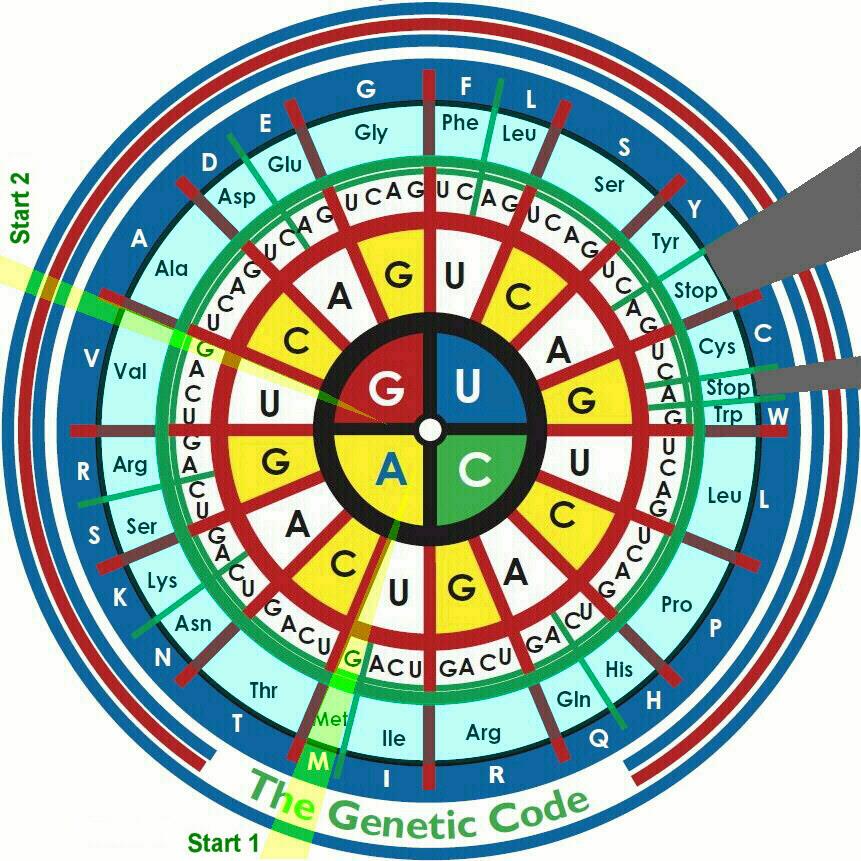 Рис. 18 Названия кодонов надо читать по радиусам, начиная от центра. Снаружи круга можно прочитать сокращенные названия соответствующих им аминокислот. Зеленым цветом обозначены сектора стартовых кодонов генов, а желтым - терминирующие (финальные, финишные) кодоны, которым не соответствует ни одна аминокислота (из-за чего синтез белка на этом и прекращается). Эта картинка бывает и гораздо более красивой, например, такой (англоязычный вариант):