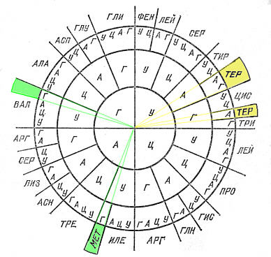 Гораздо изящнее все это смотрится, если данную таблицу свернуть в тройной круг (названия аминокислот в наружном слое для экономии места записаны в сокращенном виде):
