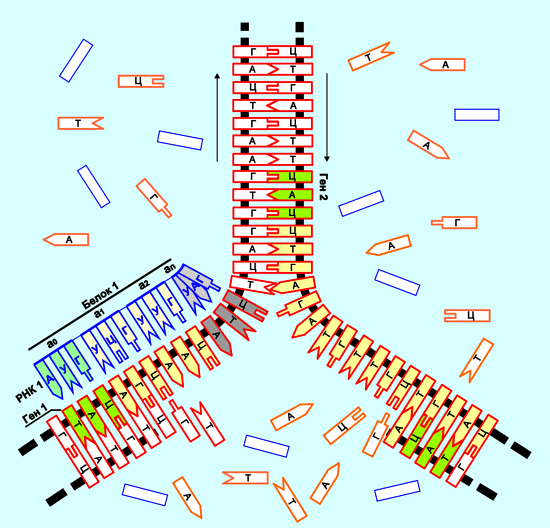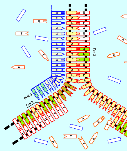 При разрыве поперечных связей, что возможно не только при репликации ДНК, а и "просто" под влиянием температуры или особых химических веществ - ферментов, в частности - полимеразы, в разрыв могут устремляться не только нуклеотиды ДНК-типа (d), а и РНК-типа (r), те есть, нуклеотиды т.н. урацилового ряда, синие на данном рисунке. (Описны они выше, в подразделе Нуклеотиды). Стоит только стартовую группу ТАЦ гена 1 захватить трем таким нуклеотидам (группа АУГ), по описанному выше комплементарному принципу, как все дальнейшее заполнение разрыва, до самого конца гена, будет проводиться уже именно (и только!) нуклеотидами r-типа. В результате формируется "синяя" цепочка, последовательность триад, которая и образует в конце-концов то, что называется матричной РНК. (Из-за того, что эта РНК как бы снимает отпечаток с гена).