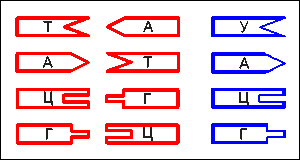 Серьезным логическим препятствием на пути понимания генетического кода является одностороннесть соответствий кодон - АК. Прямо - однозначная зависимость, обратно - неоднозначная. Как это возможно (и возможно ли вообще)? Для снятия кажущегося противоречия надо умозрительно, чисто теоретически, представить себе, при каких условиях может срабатывать подобная логика. И что для этого нужно. Думается, что она может быть разрешена при помощи каких-то гипотетических соединителей-переходников, размещаемых между свободными концами нуклеотидов мРНК, и притягиваемой к каждой их троице (кодону) аминокислотой.Из поставленных условий такие соединители вполне можно "изобрести". Ясно, что они должны быть асимметричными. С одной стороны у них должно быть 64 варианта каких-то тройных отростков, для контакта с любым вариантом кодона РНК. С другой стороны этой гипотетической структуры должны быть отростки (на деле - это выступающие атомы), пригодные для связи с 20-ю наиболее оптимальными аминокислотами (число таких отростков может быть разным, требуемым для охвата всех 20 вариантов этих АК). Гипотетически (и в схематическом представлении) они должны выглядеть примерно так: