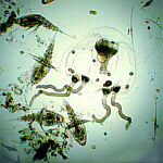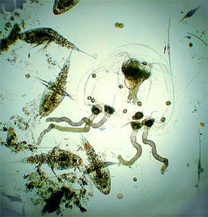 здесь было бы уже явно излишним. Вот откуда берется столь большое количество вариантов строения этих клеток. Интересно, что в скелеты радиолярий никогда не встраивается типичный для большинства иных биологических видов кальций (то есть, известняки). Зато кроме SiO2 в них нередко попадается сульфат стронция SrSO4. Это вносит большое разнообразие и в форму скелетов, и в их окраску. (Но на представленных выше фото они подсвечены искусственно). Питание этих созданий природы, относящихся к зоопланктону, происходит через перфорации их полупроницаемых оболчек. То есть, радиолярии являются эукариотами ("хищниками"). Кислород в растворенном в воде виде они получают непосредственно от фитопланктона (типичный пример симбиоза), не прилагая к этому никаких специальных усилий. (Точно так же, как и человек из земной атмосферы). Скопления