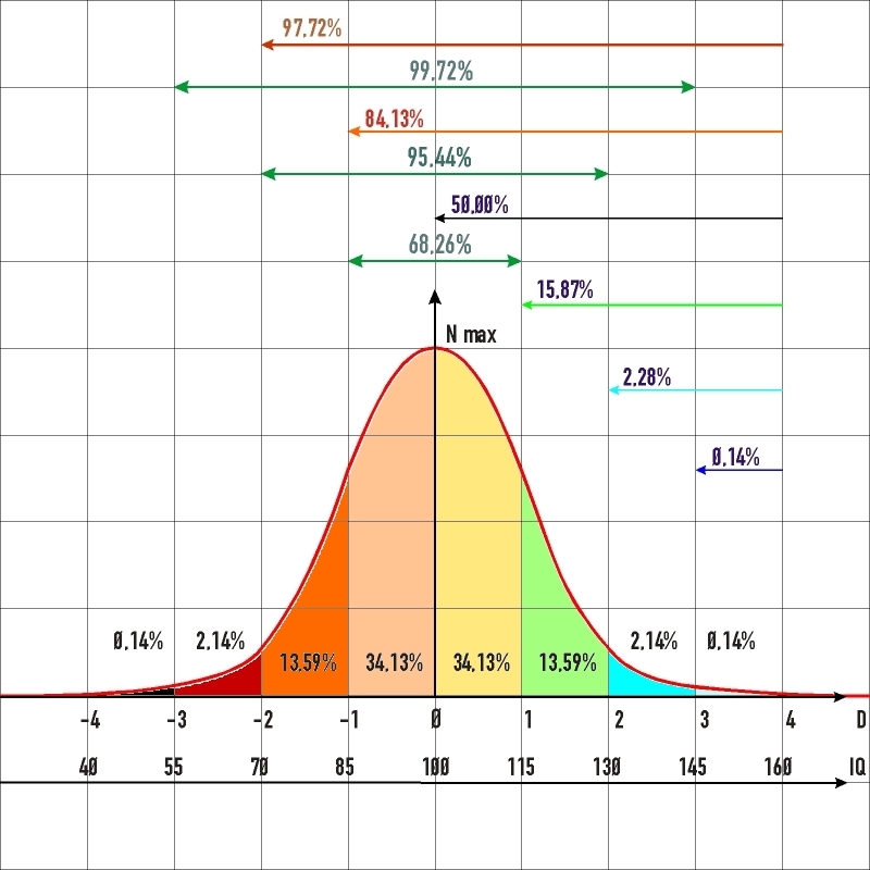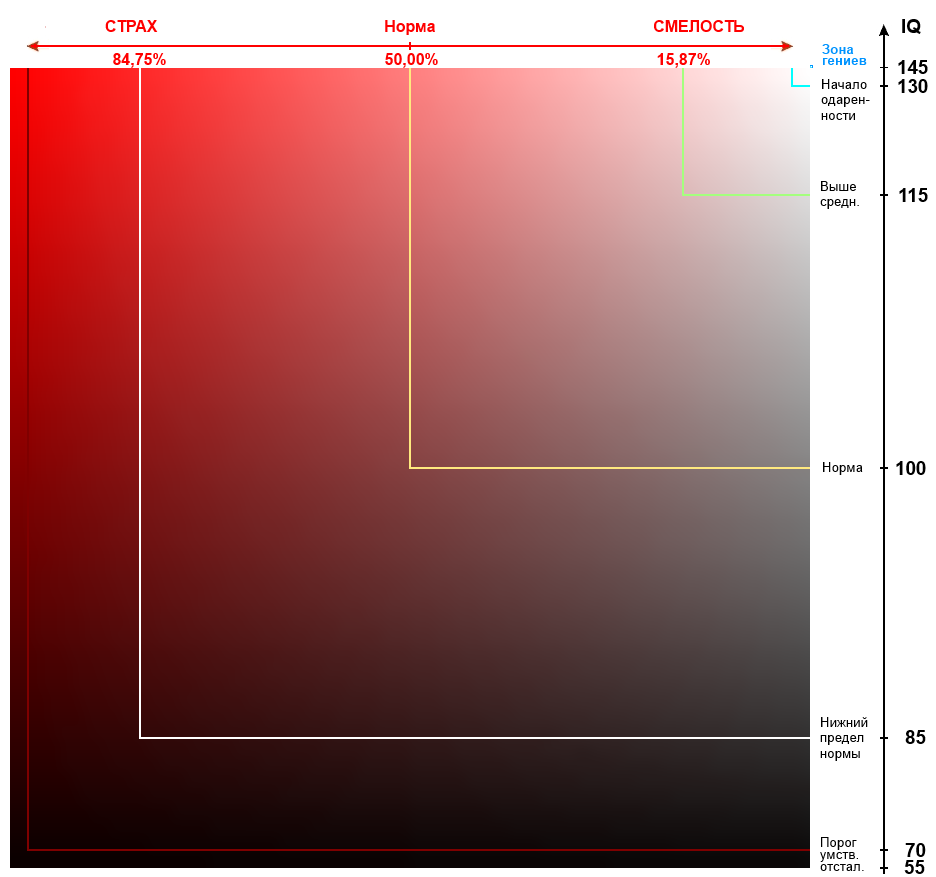 Красным цветом на этом графике слева направо условно показана возможная интенсивность страха того или иного члена общества (вообще, и перед неотвратимой смертью, в частности). Для охвата любого теоретически возможного его уровня, интенсивность этой составляющей заливки ослабевает от 100% в левой части рисунка до нуля в крайней правой. Черным цветом показан диапазон уровня глупости человеческого сообщества, убывающий от 100% в нижней части рисунка до нуля в крайней верхней его части (где условно подразумевается полное просветление лучших умов человечества). Среднестатистическим узучением типичного уровня страха человека по-настоящему всерьез пока еще никто не занимался. Проводившиеся разными исследователями тесты касались, как правило, узких групп людей, радикально отличающихся по возрасту и виду деятельности (студенты, военнослужащие, пожарные, космонавты). Общепризнанные цифровые параметры этой психологической характеристики не введены. Хотя у некоторых авторов можно найти и вводимые ими параметры, как то - относительный уровень конкретного вида страха, по шкале от нуля до 10 (20 или 100), определяемый субъективно каждым исследуемым субъектом, так и обощающие параметры, например, ИПС - интегрированный показатель страха, являющийся простой арифметической суммой всех частных оценок. Но ни число видов страха при тестировании, ни их конкретные виды никакими регламентами не устанавливаются. Более того, многие из вопросов, касающиеся того или иного вида страхов, заранее предполагают (или допускают) недостоверность ответов, например, связанные с семьей, служебной карьерой, общественным мнением, методами лечения и др. * * * * * * * Совсем другая ситуация сложилась в исследованиях уровня интеллекта. Очевидно, это связано со значительно большей ценностью этого параметра, особенно, при приеме на работу потенциальных кандидатов. Этот раздел психологии опирается на математические методы статистического анализа вероятностных данных. Математика (Гаусс и последователи) давно установила, что распределение вероятностей случайных процессов описывается так называемой нормальной кривой. Это такой себе колоколообразный холмик на графике, который показывает изменение вероятности события (любого) по отношению к максимально возможному ее уровню, в зависимости от степени отклонения (удаления) от точки этого максимума. Это отклонение измеряется через равные промежутки заданной величины (любой). Математическая формула для построения этой "нормальной" кривой весьма сложна, поэтому мы используем ее в готовом виде. Благо дело, она показывает свою достоверность на протяжении уже почти двух столетий. А в самой природе работает миллиарды лет.