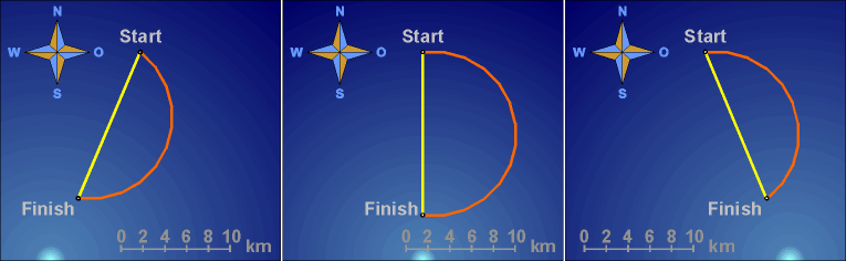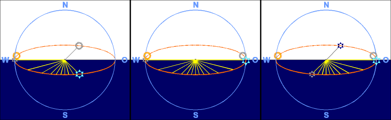 На этих рисунках, с большим количеством условностей и упрощений (которые, тем не менее, не исказят ни промежуточных, ни итоговых выводов), изображены все три основных варианта видимости Вифлеемовской звезды, перечисленные чуть выше. На каждом из них голубой окружностью в плоскости рисунка показана линия видимого горизонта и направления по сторонам света. А если мысленно заглянуть за горизонт и представить рисунок объемным , то этой же окружностью условно можно считать показанным и весь наш земной шар. (Хотя о шарообразности нашей планеты мудрецы того времени, скорее всего, даже не догадывались). Оранжевой кривой условно показана видимая (кажущаяся) наблюдателям с поверхности Земли "орбита" Солнца и звезд экваториальной зоны "вокруг Земли". Примерно по ней же перемещалась некоторое время и сама судьбоносная Вифлеемовская звезда. Эллиптичность (на рисунке) этой кривой подчеркивает то обстоятельство, что ее плоскость (на самом деле это плоскость орбиты Земли вокруг Солнца) не совпадает с плоскостью рисунка, а, главное, с плоскостью участка поверхности Земли, по которой двигались наши путешественники. (На широте Израиля, да еще зимой, они чуть ли не перпендикулярны друг другу). Светлый фон рисунка условно показывает освещенную (дневную) часть земного шара, в данный момент - не имеющую для нас никакого значения, темно-синий - затененную (ночную) его часть. Интересующие нас светила показаны яркими цветами в момент возможного начала видимости "звезды", блеклыми (серыми) - в момент завершения наблюдения, из-за его дальнейшей невозможности. Для третьего варианта показано (почти черным цветом) еще одно положение "звезды", когда она в момент захода Солнца находится еще далеко за восточным горизонтом, и ее появления надо ждать несколько часов. Придерживаясь направления звезды, мудрецы-путешественники всякий раз должны были двигаться по огромным дугам, сначала медленно загибающимся с восточного (или юго-восточного) направления на южное, а со второй половины ночи, так же постепенно, - с южного на западное (или юго-западное). Если в это время посмотреть (умозрительно) на мудрецов с высоты птичьего полета, то в течение ночи можно было бы обнаружить следующие траектории их перемещения (показаны на рисунках красным цветом; представлены для всех трех возможных случаев взаимного расположения звезды и Солнца):