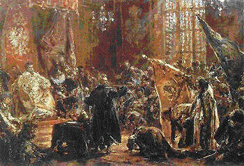 Итак, Самозванец побывал сначала в Брагине, Киеве, возможно, - на Запорожской сечи и оказался наконец в Самборе (неподалеку от Львова). Там он остановился у местного воеводы Юрия Мнишека. Познакомился с его дочерью Марианной (Мариной). Молодые люди полюбили друг друга. Во время болезни (скорее всего, притворной) Самозванец открыл воеводе и его дочери "тайну" своего царского происхождения, предъявив фамильный крест и особые личные приметы (асимметрия строения тела, характерная бородавка). После того, как Самозванец в толпе узнал Петрушу/Пиотровского (бывшего слугу Дмитрия-царевича в Угличе), сомнений в его подлинности не осталось ни у кого, и местный князь Казимир Вишневецкий (по другим сведениям - Адам) повез Самозванца на аудиенцию к королю Сигизмунду. Неизвестно, поверил ли сам Сигизмунд в версию Самозванца, но он сообразил, что данного человека можно использовать для борьбы против московского царя Бориса Годунова и внедрения католицизма в России. Сам Самозванец принял католицизм в ордене иезуитов и поклялся нести его русским. За это король выделил ему вооруженный отряд и дал свое благословение. Военные действия в России с участием Самозванца мы здесь рассматривать не будем. Отметим только, что большинство городов на его пути охотно принимало версию чудесно спасшегося Дмитрия, открывали ему городские ворота и присягали "истинному" царю. Задержка (на 2 года!) наступления Самозванца на Москву случилась только в результате вооруженного столкновения с правительственными войсками под руководством В.Шуйского. За это время Самозванец сильно укрепил свое войско за счет добровольно присоединяющихся к нему казаков (донских, волжских и днепровских), а также дружин из городов, признавших его. Надо отметить, что польская часть войска была наименее дисциплинированной, не смотря на имеющуюся воинскую выучку. А казаческая часть армии Самозванца только и мечтала о том, чтобы побыстрее захватить Москву и приступить к грабежам ее богатого населения. Уже во время этого похода Самозванца аудиенцию у короля получила также и Марина Мнишек. Она получила его (и папского посла) согласие на брак с претендентом на русский трон, а также поручение о ее дополнительном влиянии на будущего царя для внедрения католицизма в России и объединению церквей под руководством Папы Римского. Но Марина была очень амбициозной и гордой, и заявила, что выйдет замуж за "Дмитрия" только после того, когда он станет царем.