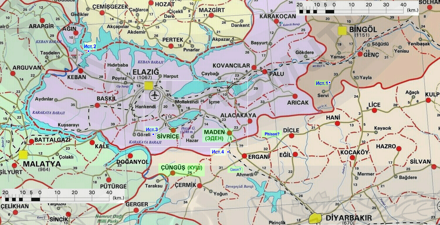N(ehri) - Тигрица Черная. Тогда Геоном (Гихоном) может быть только относительно небольшая горная река, начинающаяся рядом с Маденом (см. точку Ист.4), на которой однако построили довольно крупное (по местным масштабам) водохранилище, питающее водой город Диярбакур. Размеров этой речки достаточно для того, чтобы охватить своим течением всю "землю Куш" с востока, если в качестве таковой посчитать юго-западный сектор региона, примерно по ломаной линии Гюнгюш - Ахетли - Пиринчлик - Йогун - Чермик, прихватывая еще и немного к югу), отделяя ее от расположенных далее земель Хавила.