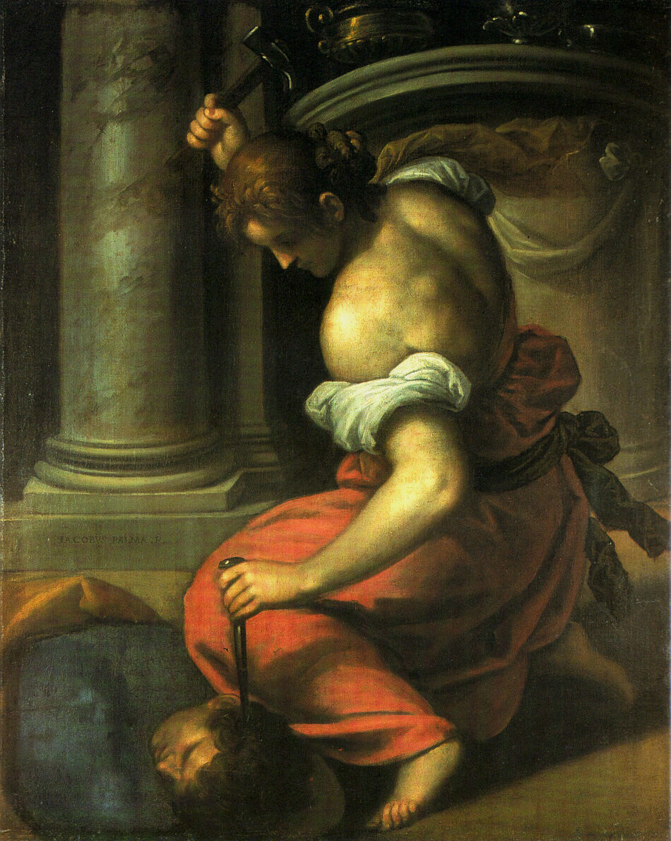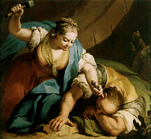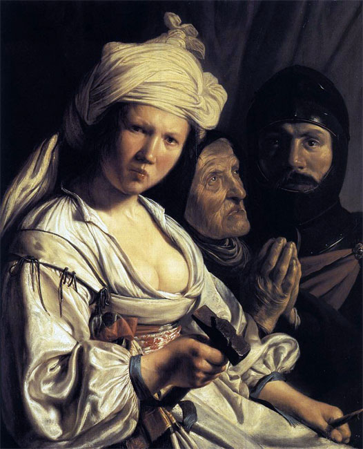 сказано и объявлено ей в откровении. Олоферн с радостью пристал на такое предложение, так как с первого взгляда на Иудифь возжелал ее в своих нечестивых мыслях. Три дня пребывала Иудифь в шатре, и три ночи подряд выходила в долину, где она омывалась водою ручья (просто от неприятельского духа) и молилась Богу о судьбе своего народа. Наконец, на четвертый день Олоферн осмелел настолько, что через своего евнуха попросил еврейку "есть и пить" с ними. А прислугу (лишние глаза и уши) в этот вечер решил отпустить. Иудифь приняла предложение, вырядилась в лучшие одежды, зашла в шатер и "возлегла". Начался ужин, перешедший в пир. Поначалу прием обслуживали рабы Олоферна, а позже - только служанка Иудифи. Она же приготовила и еду, которую брала и ела сама Иудифь. Оба выпивали, причем, Олоферн в этот вечер выпил вина больше, чем в какой-либо иной день своей жизни. То ли от радости от предстоящих утех, то ли от волнения перед такой красотой. Когда после затянувшегося ужина вся обслуга разошлась и залегла спать, в шатре оставались только Олоферн и Иудифь. Причем, от избытка выпитого Олоферн просто упал на свое ложе. И тогда Иудифь, коротко помолившись, взяла меч Олоферна и изо всей силы, двумя ударами, отсекла его голову от туловища. Тот даже и не охнул. После этого Иудифь передала голову своей служанке, которая спрятала ее в мешок со съестными припасами. А уже после этого обе женщины потихоньку вышли из шатра, "на молитву", в поле. Уже привыкшая к этой процедуре охрана никаких препятствий чинить им не стала. Иудифь добралась до городских ворот, постучала в них и прошла в город. Достала из мешка голову Олоферна и коротко рассказала старшинам города обо всем происшедшем. Все были в полном изумлении. Голову эту выставили на одном из зубцов городской крепостной стены. Но в первые несколько часов это не произвело никакого впечатления на ассирийцев, потому что они и подумать не могли, что это голова их военачальника. Тогда Иудифь направила небольшую группу воинов за городские ворота, но с приказом не вступать в бой. С тем, чтобы осаждающие город только увидели их и доложили об этом своему руководству. Когда этот отряд вышел за стену, вражеские наблюдатели поспешили к шатру Олоферна, чтобы получить от него указания о своих дальнейший действиях. И только здесь обнаружилось, что он не спит, как это обычно бывало с ним (в течение всей первой половины дня), а валяется в шатре обезглавленным. В стане завоевателей началась самая настоящая паника, от рабов и простых воинов до самых высших начальников войск. Все они в ужасе и от бессильной злости начали рвать на себе одежды, а затем бросились бежать, куда глаза глядят. А "сыны Израиля" бросились их преследовать и массово уничтожать. Население Ветилуи целый месяц расхищало и растаскивало брошенный лагерь ассирийцев... Три месяца продолжалось затем празднование этой победы и в Иерусалиме. "Не от юношей пал сильный их [Олоферн], не сыны титанов поразили его, и не рослые исполины налегли на него, но Иудифь, дочь Мерарии, красотою лица своего погубила его..." (Иудифь.16,6). "Иудифь приобрела великую славу и состарилась в доме мужа своего, прожив до ста пяти лет, и отпустила служанку свою на свободу". (Иудифь.16,23).