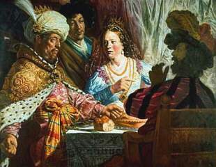 На третий день непрерывных молитв Есфирь одела свои лучшие царские одежды и во всей своей великолепной красоте направилась к царю, остановившись во внутреннем дворе, напротив главного входа во дворец. Царь в этот момент сидел на троне, как раз напротив входа. Увидев Есфирь, царь поспешно встал с трона, вышел навстречу царице и принял ее в свои объятья. На всякий случай дал ей притронуться к своему золотому скипетру. Тут Есфирь как бы(?) упала в обморок (то ли схитрив, то ли от непрерывного трехдневного поста во время своей молитвы за народ Израиля), из-за чего царь сильно смутился и тут же пообещал царице выполнить любую ее просьбу, вплоть до передачи ей половины царства. Но Есфирь попросила его просто прийти к ней вечером на пир, прихватив с собой Амана. Пировали целый вечер, а когда царь спросил, какая у Есфири есть к нему просьба, она просто пригласила прийти на пир еще и назавтра, и опять вместе с Аманом. Уходя с пира, Аман снова увидел Мардохея, который и на этот раз не стал ему кланяться. Наверное, к тому времени Аман уже знал, что Мардохей - близкий родственник царицы, поэтому стерпел такое неуважение. А дома излил душу по этому поводу своей жене Зереши. Та не придумала ничего лучше, как установить "дерево вышиною в пятьдесят локтей" и посоветовать царю прямо с утра повесить на нем Мардохея, за постоянное неуважение к своему "соуправителю" и за невыполнение распоряжения царя по этому поводу. А у царя ночью была сильная бессонница, и от нечего делать он стал просматривать свой дневник. И нашел место, в котором было записано, как Мардохей спас его от смерти, предупредив о замысле дворцового переворота. И что это доброе дело осталось не вознагражденным. И решил, что настало время отблагодарить своего спасителя. Наутро возле дворца уже стояло высокое дерево, на котором Аман собирался повесить Мардохея. Но Аман не успел изложить царю свою просьбу, потому что тот опередил его вопросом, как следовало бы отметить человека, которого царь хочет вознаградить наивысшей почестью. Аман, посчитав, что речь идет именно о нем, правой руке царя, тут же наговорил целую кучу пожеланий: и царскую одежду на этого человека одеть, и подать ему царского коня, и царский венец на голову возложить, и на центральную площадь города в таком виде вывести, и произнести там соответствующее славословие. И царь тут же повелел все это сделать для Мардохея, причем, Аману следовало самолично провести коня с Мардохеем на городскую площадь и произнести там речь во его славу. Пришлось Аману пройти через такое для себя унижение.