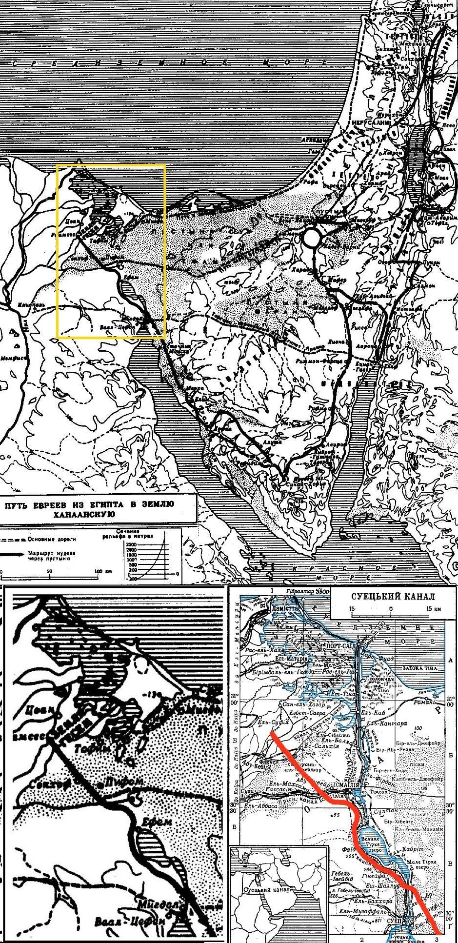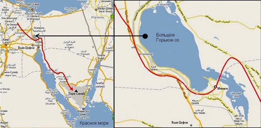 При этом становится очевидным, что евреи вообще не шли через Красное море, как и через какое бы то ни было другое (если карта в Библии верна). На самом деле их путь пролегал через узкий и неглубокий проток между северной частью Красного моря, именуемой в наше время Суэцким заливом, и Малым Горьким озером (через которое уже в наши времена, в 1867 г. проложен Суэцкий канал).