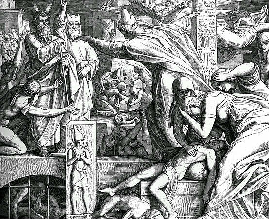 * * * * * * * Поскольку евреи тогда жили уже в тех же поселках, что и египтяне, для отличия домов, в которых проводилось указанное ночное поедание мяса, то есть, где жили евреи, необходимо было кровью зарезанного ягненка (или козлика) помазать на обоих косяках и на перекладине дверей в домах: 7 и пусть возьмут от крови его и помажут на обоих косяках и на перекладине дверей в домах, где будут есть его; 12 А Я в сию самую ночь пройду по земле Египетской и поражу всякого первенца в земле Египетской, от человека до скота, и над всеми богами Египетскими произведу суд. Я Господь. [Здесь Моисей фактически отождествляет с Господом самого себя] 13 И будет у вас кровь знамением на домах, где вы находитесь, и увижу кровь и пройду мимо вас, и не будет между вами язвы губительной, когда буду поражать землю Египетскую. (Исх,12,1–13). Всевидящему и всезнающему Господу надо было еще зачем-то помечать снаружи дома, в которых жили евреи. Значит, невозможно было обойтись без помощников (не таких всевидящих). Это предположение далее находит прямое подтверждение: всемогущий Господь действительно не в состоянии сам, единолично, осуществить задуманную массовую кровавую бойню и нуждается в услугах палачей: 23 И пойдет Господь поражать Египет, и увидит кровь на перекладине и на обоих косяках, и пройдет Господь мимо дверей, и не попустит губителю войти в домы ваши для поражения. (Исх,12,23). Кто такой этот губитель, точнее, эти губители (ведь их надо было иметь очень много!), откуда они взялись? Несомненно, это был какой-то особый отряд головорезов, тайно подготовленный Моисеем и Аароном. (У Аарона такая возможность, несомненно, была, ведь он, судя по всему, вообще не покидал Египта и как родной брат усыновленного в свое время дочерью фараона Моисея, скорее всего, жил в царском дворце или где-то рядом с ним и имел большое влияние). 3 …да и Моисей был весьма велик в земле Египетской, в глазах [фараона и] рабов фараоновых и в глазах [всего] народа (Исх,11,3).