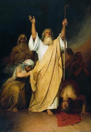 * * * * * * * Так называемые чудеса, творимые Моисеем по пути в землю будущего проживания, могут иметь легкие и простые естественные объяснения или являются элементарными фокусами: Манипуляциями с огнем и так называемой «водой», которая «чудесным» образом сгорала, позже занимались также Илия (см. соответствующую главу) и, с огромной степенью вероятности, его ученик Елисей. И уж, абсолютно точно, - Неемия. Описание действий последнего наиболее полно раскрывает суть этих «чудес»: ... не нашли огня, а только густую воду, тогда он приказал им, почерпнув, принести ее; и когда потом приготовлены были жертвы, Неемия приказал священникам окропить этою водою дрова и положенное на них. Когда же это было сделано и наступило время, когда просияло солнце, прежде закрытое облаками, тогда воспламенился большой огонь, так что все удивились. (2 Мак,1,20-22). [вероятно, через драгоценный камень, сыгравший фунцию линзы] 31 Когда же жертва была сожжена, Неемия приказал оставшеюся водою полить большие камни. 32 Как только это было исполнено, вспыхнуло пламя (2 Мак,1,31-32). 36 Бывшие с Неемиею прозвали это место Нефтар, что значит: "очищение"; многими же называется оно Нефтай (2 Мак,1,36). А все внимательные читатели, в первую очередь, усмотрят в словах Нефтар и Нефтай корень этих слов - «нефть». И тут уж рассеются последние сомнения о химическом составе чудодейственной « воды». Практически все «пророчества» Моисея есть его собственные (со ссылками на разговоры с Господом) планы написания свода законов и морально-этических принципов (обязательных к исполнению и исключительно жестоких), в т.ч., заповедей. А в конечном итоге, свершения главного дела своей жизни , перевешивающего даже исход из Египта, - создания иудейской религии и церкви. Мелкими пророчествами Моисей практически не занимался. Особо яркой страницей всего Исхода стала история обретения Моисеем каменных скрижалей с заповедями Господними. Эта история однажды была описана так. Ведомые Моисеем евреи (через т.н. пустыню, в которой они годами, десятками лет благополучно выпасали свои огромные стада) устали от постоянных невзгод и начали потихоньку роптать. А кое-кто – и погромче. Авторитет Моисея начал ослабевать. Вот тогда он и решил предпринять восхождение на гору Синай, как было объявлено, на аудиенцию с самим Господом-Богом. Чтобы показать всем остальным, что он все еще их лидер, и не абы какой. Поднялся, и 40 дней дожидался встречи. Почему так долго? Злые языки утверждают, что примерно столько времени потребовалось бы Моисею, чтобы собственноручно высечь на двух плоских каменных плитах (т.н. «скрижалях») текст 10 заповедей Господних. Мы там не были, нам не судить. Общепринятая точка зрения состоит в том, что Моисей таки дождался встречи с Господом и получил от него скрижали завета с заповедями, которые Господь лично высек на камнях. Было ли все именно так или несколько иначе - не принципиально. А вот длительное отсутствие Моисея в лагере сказалось на атмосфере в нем самым непосредственным и неблагоприятным образом. Потерявшие терпение, страх и стыд соплеменники Моисея решили уверовать в другого, более им понятного и зримого бога – Золотого тельца. В буквальном смысле этих слов. Собрали побольше золота у своих женщин, переплавили его и отлили самую настоящую фигурку (как тогда говорили – кумира) в виде золотого бычка. И в 