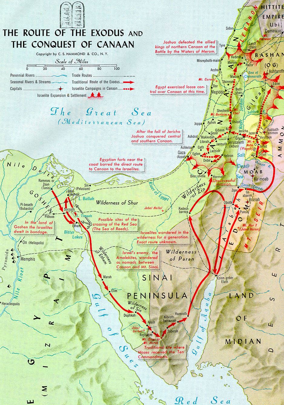 Современные археологические исследования дня Малого Горького озера в наши дни невозможны, так как через него уже 150 лет проходит Суэцкий канал. И, наоборот, периодические находки древнего оружия на дне Красного моря совсем не обязательно должны связываться историей погони фараона за евреями. Потому что в Красном море, с его многочисленными коралловыми островами и отмелями, погибло такое количество разных кораблей, которое по своему числу значительно превосходит количество воинов в армии любого фараона. А на них перевозилось все, что угодно. * * * * * * * Самое удивительное в истории пророчеств Моисея заключается в том, что он, сумевший, несмотря ни на что, организовать и осуществить исход из Египта, так и не сумел определить конкретную конечную цель путешествия. Об этом свидетельствуют, в первую очередь, так называемые 40-летние скитания евреев по пустыне. Еще во времена Иакова, Иосифа и его братьев расстояние от нынешней территории Палестины и Израиля (в те времена – земли Филистимские, Ханаанские и прочие) до Египта покрывалось верхом за несколько дней, а на обозах - примерно за месяц. А тут – 40 лет. Маршрут Моисея многие годы проходил именно по тем землям, которые потом (уже после его смерти) как раз и были признаны в качестве «земли обетованной» (правильное ударение в слове обЕтованной – надо бы, в отличие от общепринятого произношения, ставить на е; так как оно происходит от слова обет - обещание). Великий пророк Моисей, многократно пересекая эту землю вдоль и поперек, так ее и не узнал. Наоборот, считал ее пустыней. Эти 40-летние скитания реально сопровождались многомесячными, иногда и по несколько лет, остановками в долинах и оазисах. Скорость перемещения и необходимость смены места определялась, ФАКТИЧЕСКИ, многочисленными стадами скота, которые все время были в пути, вместе с людьми. Это типичный образ жизни кочевых племен, какими и были, по сути, древнееврейские племена еще в доегипетскую эпоху. Бродили за скотом, а делали вид, что ходят за облаком Божьим (Лев,40,36-37 и Чис,9,16-17).