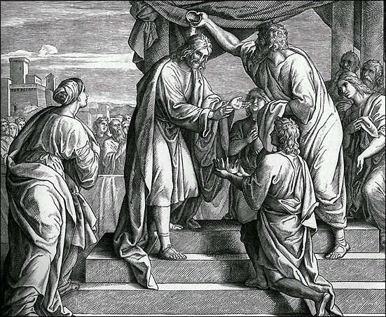 В конце эпохи судей, примерно через четыреста лет после Моисея и Иисуса Навина (если обобщить приведенные в Библии, хотя и не полные, данные по всем судьям израильским), на исторической арене появился Самуил. Самуил - долгожданный сын в простой семье Елканы (из колена Ефрема) и его длительное время бесплодной жены Анны. Анна так сильно хотела иметь ребенка, что во время своих молитв к Господу постоянно просила его об этом. Одну из этих молитв услышал священник и тогдашний судья Израиля (15-й по счету) Илий. Илий обнадежил Анну: 17 И отвечал Илий и сказал: иди с миром, и Бог Израилев исполнит прошение твое, чего ты просила у Него. (1 Цар,1,17). Так и случилось: ... И познал Елкана Анну, жену свою, и вспомнил о ней Господь. 20 Чрез несколько времени зачала Анна и родила сына и дала ему имя: Самуил ... (1 Цар,1,19-20). За проявленную милость Господа, после того, как Самуил был отнят от груди и подрос, Анна отдала сына Илию: и привела отрока [Анна мать] к Илию 26 и сказала: о, господин мой! да живет душа твоя, господин мой! я -- та самая женщина, которая здесь при тебе стояла и молилась Господу; 27 о сем дитяти молилась я, и исполнил мне Господь прошение мое, чего я просила у Него; 28 и я отдаю его Господу на все дни жизни его, служить Господу (1 Цар,1,25-28). За это Господь потом послал Анне еще трех сыновей и двух дочерей. Самуил прошел у Илия весь необходимый курс обучения, был высокоморальным юношей. Вначале он почти не проявлял признаков своей будущей пророческой деятельности: ... слово Господне было редко в те дни, видения были не часты (1 Цар,3,1). Однако, потом видения и голос Господа стали посещать Самуила все чаще (не удивительно, ведь религиозная деятельность была единственным содержанием его жизни), появились реальные предсказания, например, о судьбе двух беспутных родных сынов Илия (хотя иное будущее этим аморальным типам никак нельзя было спрогнозировать). 19 И возрос Самуил, и Господь был с ним; и не осталось ни одного из слов его неисполнившимся. 20 И узнал весь Израиль от Дана до Вирсавии, что Самуил удостоен быть пророком Господним (1 Цар,3,19-20). После смерти Илия Самуил стал очередным (фактически - последним) судьей Израиля. 1 Когда же состарился Самуил, то поставил сыновей своих судьями над Израилем. 2 Имя старшему сыну его Иоиль, а имя второму сыну его Авия; они были судьями в Вирсавии. 3 Но сыновья его не ходили путями его, а уклонились в корысть и брали подарки, и судили превратно. 4 И собрались все старейшины Израиля, и пришли к Самуилу в Раму, 5 и сказали ему: вот, ты состарился, а сыновья твои не ходят путями твоими; итак поставь над нами царя, чтобы он судил нас, как у прочих народов (1 Цар,8,1-5). Вначале, естественно, Самуилу это не понравилось (грядущая потеря реальной власти его сыновьями). Но делать было нечего, старейшин он послушался. Самуил установил права будущего царя и обязанности всех его будущих подданных (фактически - абсолютный правовой беспредел!). Царь сделает и возьмет у любого все, что захочет, а все будут ему рабами (1 Цар,8,11-17). Но народ все равно сказал: ... пусть царь будет над нами, 20 и мы будем как прочие народы (1 Цар,8,19-20). Вскоре произошло и персональное назначение, т.н. помазание на царство. Помазание - это и символическая процедура, и буквальное измазывание человека специальным ароматным маслом (смесью масел) - т.н. миром (от слова миро), с головы до ног, подобно знатным 