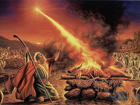 (Наверное, почти не оставалось. Был в крайне тяжелом состоянии, возможно, в преддверии смерти. но о самой смерти даже и не сказано, хоть ничего не стоило). Тогда Илия воззвал к Господу, 22 И услышал Господь голос Илии, и возвратилась душа отрока сего в него, и он ожил (3Цар,17,17-22). (То, что сын перед этим таки умер, категорически, все же, не утверждалось. Да и не могло утверждаться, летописец ведь не врач, да и писал значительно позже). Какие-то не очень убедительные чудеса. Илия встречался с царем Ахавом (по желанию последнего) и упрекал его в вероотступничестве. (Это одна из главных причин, почему он так высоко чтим церковью и поныне). Позже Илия вступил в соревнование с 450-ю (по другим данным - с 850-ю) пророками Валааловыми (священниками языческой жены Ахава - Иезавели). Суть соревнования состояла в том, чей бог сможет вызвать самовозгорание специальных контрольных костров с жертвенными тельцами. Как и в свое время Моисей, Илия хорошо умел управляться с огнем, умел поджигать и «воду». (На Ближнем Востоке и по настоящее время имеются нефтяные месторождения с прозрачной нефтью, которую безо всякой очистки можно заправлять прямо в дизели, вместо солярки. Вот такую «воду», видимо, и поджигали делающие чудеса с ней Моисей и Илия, а позже - и Елисей). У местных пророков, как и следовало ожидать, за целый день так ничего и не вышло: 26 И взяли они тельца, который дан был им, и приготовили, и призывали имя Ваала от утра до полудня, говоря: Ваале, услышь нас! Но не было ни голоса, ни ответа. И скакали они у жертвенника, который сделали. 27 В полдень Илия стал смеяться над ними и говорил: кричите громким голосом, ибо он бог; может быть, он задумался, или занят чем-либо, или в дороге, а может быть, и спит, так он проснется! 28 И стали они кричать громким голосом, и кололи себя по своему обыкновению ножами и копьями, так что кровь лилась по ним. 29 Прошел полдень, а они всё еще бесновались до самого времени вечернего жертвоприношения; но не было ни голоса, ни ответа, ни слуха (3 Цар,18,26-29). То есть, они старались в светлое время дня, и дразнимые Илией с полудня, потратили на это весь день. (Очевидно, для того, чтобы Илие пришлось совершать свои трюки в сумерках). 31 И взял Илия двенадцать камней, по числу колен сынов Иакова ..., (ясно, что c помощью камней несложно высечь искру, например, ударив по ним посохом, в основание которого встроен еще один камень), 32 И построил из сих камней жертвенник во имя Господа, и сделал вокруг жертвенника ров, ... 33 и положил дрова [на жертвенник], и рассек тельца, и возложил его на дрова,