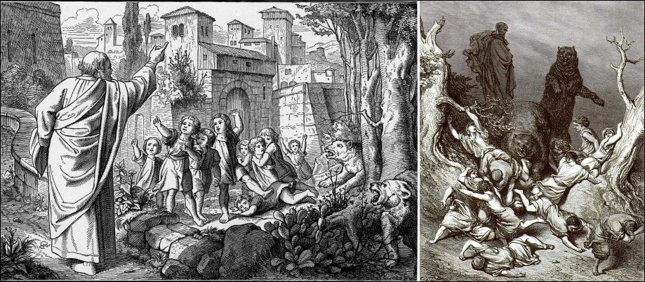 * * * * * * * Некоторые последующие «деяния» Елисея вообще не поддаются пониманию и какому-либо нормальному объяснению, например, проклятие им на смерть 42 детей, которые обзывали его плешивым. Они были растерзаны двумя медведицами (4 Цар,2,23-24).