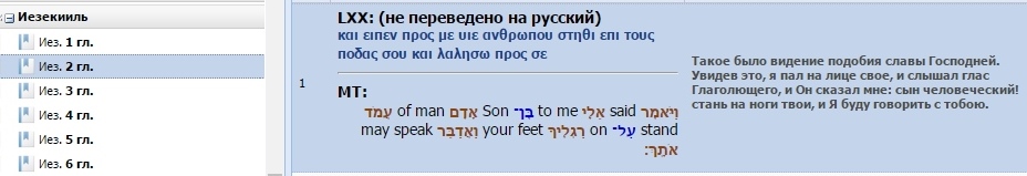 16 ... казалось, будто колесо находилось в колесе. ... [для этого хватило бы двух больших, перпендикулярно пересекающих колес, охватывающих каждого тетраморфа] - трон с восседающем Господом Богом (вот это и есть суть величия Господа, по Иезекиилю, но пока - только в этой статье): 26 А над сводом, ... было подобие престола ... как бы из камня сапфира; а над ... престол[ом] было ... подобие человека [Господь Бог!]. Правда, непонятно, на каком основании всё ЭТО (и всё ли?) в русскоязычном тексте (и только в нем!) именуется "подобием славы Господней"? (См. ближайшую нижнюю таблицу). Разве что "блаженными" были и переводчики. (Но с какого? Греческого? Так там практически одни только предлоги (в фразе Иез,2,1), и уж точно нет никакой славы Господней. Как и в иврите или английском):