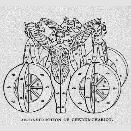 Но что же это такое, слава Господня (вообще и в представлении Иезекииля, в частности)? На всякий случай, проверяем правильность перевода самого термина. На иврите (<--): יהוה כָבוֹד. Задолго до Иезекииля это словосочетание в Ветхом Завете появлялось десятки раз (впервые - в Исход,16,7) и никаких фантасмагорических ассоциаций ни у кого не вызывало. Слава и величие подразумавались в прямом, хоть и возвышенном значении этих слов. А тут, вдруг, оказывается, что она имеет такой состав (с сокращениями): - фантастические животные, состоящие из 4 форм каждое [тетраморфы]: 4 И я видел, ... ветер ... облако ... огонь, и сияние вокруг него, - колеса системы [!?]: 15 ... и ... по одному колесу перед четырьмя лицами их.