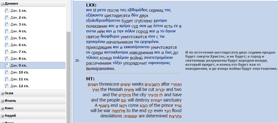 Вопреки утверждениям отцов христианской церкови, историзм книги Даниила близок к нулю. В ней перепутаны даже имена и династическая (или военно-историческая) приемственность царей. Не говоря уже о самом Данииле, его мифических товарищах и его делах. Ни разу не упомянут сын Навуходоносора - правящий сразу после него - Набонид (и даже еще при его жизни, когда тот удалился от людей в пустыню, из-за проказы). Внук Навуходоносора, Валтасар, ошибочно назван его сыном. Перепутаны годы (и даже последовательность правления!) царей-завоевателей Кира и Дария, достоверно известные всем, в т.ч., и во времена написания рассматриваемой книги (причем, совершенно не важно, когда, где и кем). На этом фоне сплошной исторической безграмотности просто чудовищной нелепостью выглядят "абсолютно точные" христианские "пророчества" книги Даниила, чуть ли не с точностью до одного года. И это в исторической (для Даниила) перспективе, составляющей около 450 лет! Составители русской редакции Библии признаются (примечаниями* в тексте), что значительной части книги в древнееврейском оригинале просто не существует. Эти ее фрагменты "открыты" греческими переводчиками-соавторами, а затем переведены и на русский (с дополнительными импровизациями на заданную тему). Указанное относится к огромной части главы 3, стихи с 24 по 90(!) и к заключительным главам книги под номерами 13 и 14 (полностью!), в которых в ярких красках описываются чудеса, якобы, творимые Даниилом и его товарищами. Но признаться в реальной фальсификации главы 9, у российских издателей духу, конечно, не хватает. (Еще бы! Ведь книга "творчески перерабатывалась" исключительно ради приведенных в завершающей части этой главы т.н. сверхточных "пророчеств", якобы связанных с именем Христа). Вот "кухня" преобразований фрагментов исходного текста в греческий, а затем в текст английской и русской Библии, по стихам 25 (фрагментарно) и 26 (согласно подстрочнику http://www.biblezoom.ru/):