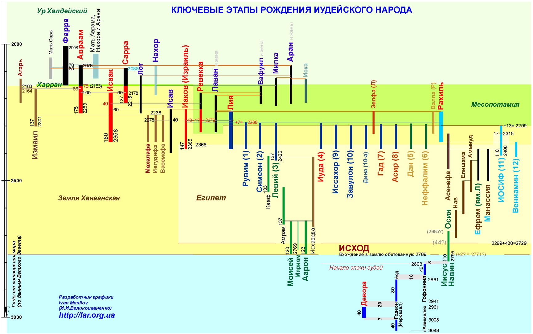 Все поколения евреев от Левия и его братьев до Моисея жили на территории Египта (благодаря выдающимся способностям Иосифа и его огромным заслугам перед Египтом), в своего рода добровольной эмиграции. В начале – на положении дорогих гостей, с поселением на лучших землях и с разными привилегиями, а в конце рассматриваемого периода – в качестве нежелательных пришельцев, дешевой рабочей силы на работах, которые евреи считали унизительными, невыносимыми для себя. В качестве примеров книге «Исход» (вторая из 5 первых книг Ветхого Завета, так называемого Пятикнижия, или Торы, написанных Моисеем и дописанных его ближайшими учениками, например, в эпизодах с описанием сцен его смерти) упоминаются полевые работы и работы по изготовлению саманных кирпичей (Исх,1,14). Тем не менее, со времен Моисея и по настоящее время сами евреи называют этот период истории египетским пленом. На самом деле они никогда не были там ни в плену, ни, тем более, рабами, как это теперь истолковывают некоторые из них. Есть в Ветхом Завете и другие, более достоверные сведения о времени проживания евреев в Египте: 40 Времени же, в которое сыны Израилевы [и отцы их] обитали в Египте [и в земле Ханаанской], было четыреста тридцать лет. 41 По прошествии четырехсот тридцати лет, в этот самый день вышло все ополчение Господне из земли Египетской ночью. (Исх,12,40-41). Очевидно, это верно (т.к. подтверждается и большим количеством других данных). Не верить этому нет никаких оснований. Это показывает, что в описанной биографии Моисея (и, что не менее важно, потомков колена Иуды, выходящих, в конце концов на царя Давида и его знаменитых потомков), имеются сильнейшие пробелы. Еще большими они должны были быть (и совершенно ясно, что были) в дорукописную (до Моисея) эпоху, эпоху устных преданий о сотворении мира, жизнеописании первых людей и их первых потомков, всемирном потопе и т.д., описанных позже в книге «Бытие».