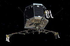 12 ноября 2014 года, через 10 лет, 8 месяцев и 10 дней после запуска с космодрома Куру силами Европейского космического агентства, спускаемый аппарат Philae lander корабля Rosetta, совершил посадку на поверхность ядра кометы 67Р/CG и передал на Землю первые данные о ее строении. Эта комета была открыта еще в 1969 году молодыми украинскими астрономами Чурюмовым и Герасименко. Миссия ЕКА к этой комете журналом Science признана наивысшим научным достижением 2014 года. Подробный отчет о событии представлен здесь. |