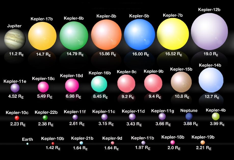 "Кеплер" блестяще справился с поставленной перед ним задачей в условиях реального космоса. Уже в первые два года он открыл большое количество весьма крупных (по сравнению с Землей) экзо-планет. (Что и не удивительно, ведь крупные планеты заметнее). Часть из них показана на следующем рисунке (цвета условные). Земля (Earth) и Юпитер (Jupiter) представлены для сравнения.