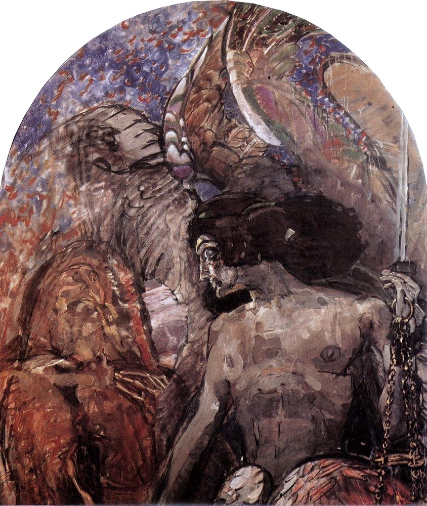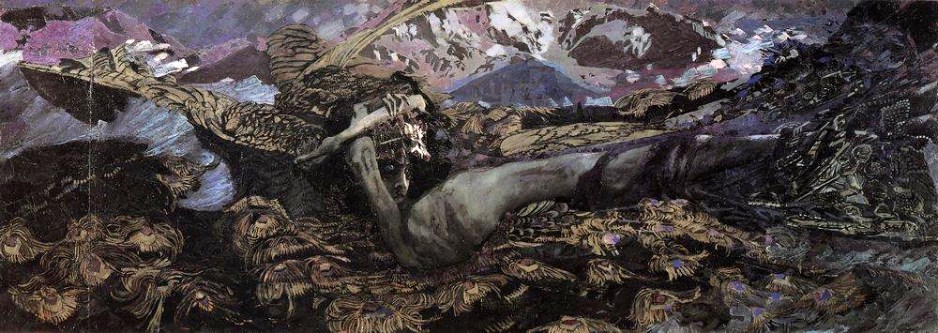 Написал художник и другие работы для оформления этой церкви («Вход Господен в Иерусалим», «Оплакивание») Тем временем тяжело заболел отец Михаила, незадолго перед этим переведенный в Казань. Напуганный сын поспешил проведать отца. Застал его живым и даже поправившимся. Врубель-старший решил покончить со службой и переехать на постоянное место жительства в Киев, где так хорошо сложилась творческая и деловая судьба его сына. А Михаил, тем временем, как говорят, увлекся цирковой наездницей, которая из Казани переезжала в Москву. И увязался за нею. И с 1890 года оказался в Москве. Как оказалось, навсегда. Тут он нашел новую группу коллег-художников, с которыми и продолжил свою деятельность. Стиль работ Врубеля становился все более зловещим. Не помогла его изменению и вторая в жизни творческая поездка в Италию. Вскоре после нее Врубеля ожидал крах в художественной жизни России. Его работы не взяли ни на выставку передвижников, ни на оформление павильонов Нижегородской ярмарки 1896 года. Зато в этом же году Врубель, оформлявший декорации в одном из частных театров Москвы, познакомился в закулисье с известной тогда певицей Надеждой Забелой. И сделал ей предложение едва ли не при первой встрече. Ему было ровно 40, ей 28. Медовый месяц молодожены провели в Швейцарии.