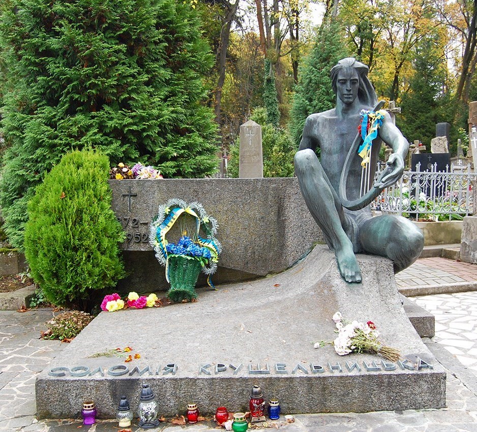 Фасад будинку Соломії Під час німецької окупації Крушельницька виживала за рахунок приватних уроків з вокалу. Зрозуміло, що їх могла дозволити або сама окупаційна влада, або польсько-українське керівництво міста, поставлене нею (ця інформація потребує уточнення). Чому вона не виїхала в той час до Італії (що була союзницею Німеччини), щоб жити там на своїй віллі та у доброму кліматі - велика загадка. Можливо, через любов до своєї батьківщини і до її людей. А, можливо, через те, що вона в цей час невдало зламала ногу, яку довго і важко лікувала у добре знайомих львівських лікарів. У післявоєнний період С. Крушельницька почала працювати у Львівській державній консерваторії ім. М. В. Лисенка. Однак її викладацька діяльність, ледь почавшись, мало не завершилася. Під час «чищення кадрів від націоналістичних елементів» їй інкримінували ще й відсутність консерваторського диплома, який пізніше знайшовся вже у фондах міського історичного музею (Соломія ж була всесвітньою знаменитістю!) Мешкаючи й викладаючи в Радянській Україні, пані Соломія, незважаючи на численні звернення, довгий час не могла отримати радянського громадянства, залишаючись підданою Італії. У 1951 році Соломії Крушельницькій присвоїли звання Заслуженого діяча мистецтв УРСР, а в жовтні 1952 року вона, нарешті, отримала звання професора, як виявилося - за місяць до її смерті. (Причому, буквально через кілька днів її знову принизили, перевівши на посаду виконуючого обов'язки професора). Востаннє співала у Львівській філармонії 1949-го, у віці 77 років. Мало хто знав, що вже на той час співачка вже хворіла на рак горла. Соломія Амвросіївна Крушельницька померла 16 листопада 1952 року. Її поховано у Львові на Личаківському кладовищі поруч з могилою друга і наставника — Івана Франка. Сьогодні ім'я Соломії Крушельницької мають Львівський оперний театр, Львівська музична середня школа, Тернопільське музичне училище (де виходить газета «Соломія»), 8-річна школа в селі Біла, вулиці у Києві, Львові, Тернополі, Рівному, Бучачі. У багатьох містах України та в міланському театрі La'Scala встановлені скульптурні зображення Соломії та меморіальні дошки. На студії ім.О.Довженка знято фільм "Повернення Батерфляй", присвячений Крушельницькій. Національний банк України у 1997 році випустив памятну монету (2 грн), присвячену співачці (без прив'язки до т.з. ювілейних дат). Вартість цієї рідкісної монети у тисячі разів перевищує значення номіналу. * * * * * * * Українські фахівці намагаються обходити питання про етнічний статус Соломії, але вже з цього факту, як і з усього іншого (прізвищ батьків, адміністративно-політичного віднесення місця народження та проживання сім'ї Соломії у дитячі роки, мови навчання в учбових закладах) зрозуміло, що за ним вона полячка. Але за своїм світоглядом, що формувався на землях стародавніх русів, під впливом поширених у цих землях народних пісень, традицій, національного (подільського) одягу, творчості великого Шевченка та спілкування з сучасною їй українською творчою інтелігенцією (і, в першу чергу, з Іваном Франком), Соломія, поза сумнівами, сформувалася як справжня, велика українка. Ми захоплюємося незрівнянним рівнем досягнень нашої талановитої землячки. А от власне відношення великої Артистки до своєї творчості було дуже вимогливим: “Я сама є своїм найсуворішим критиком, і сам