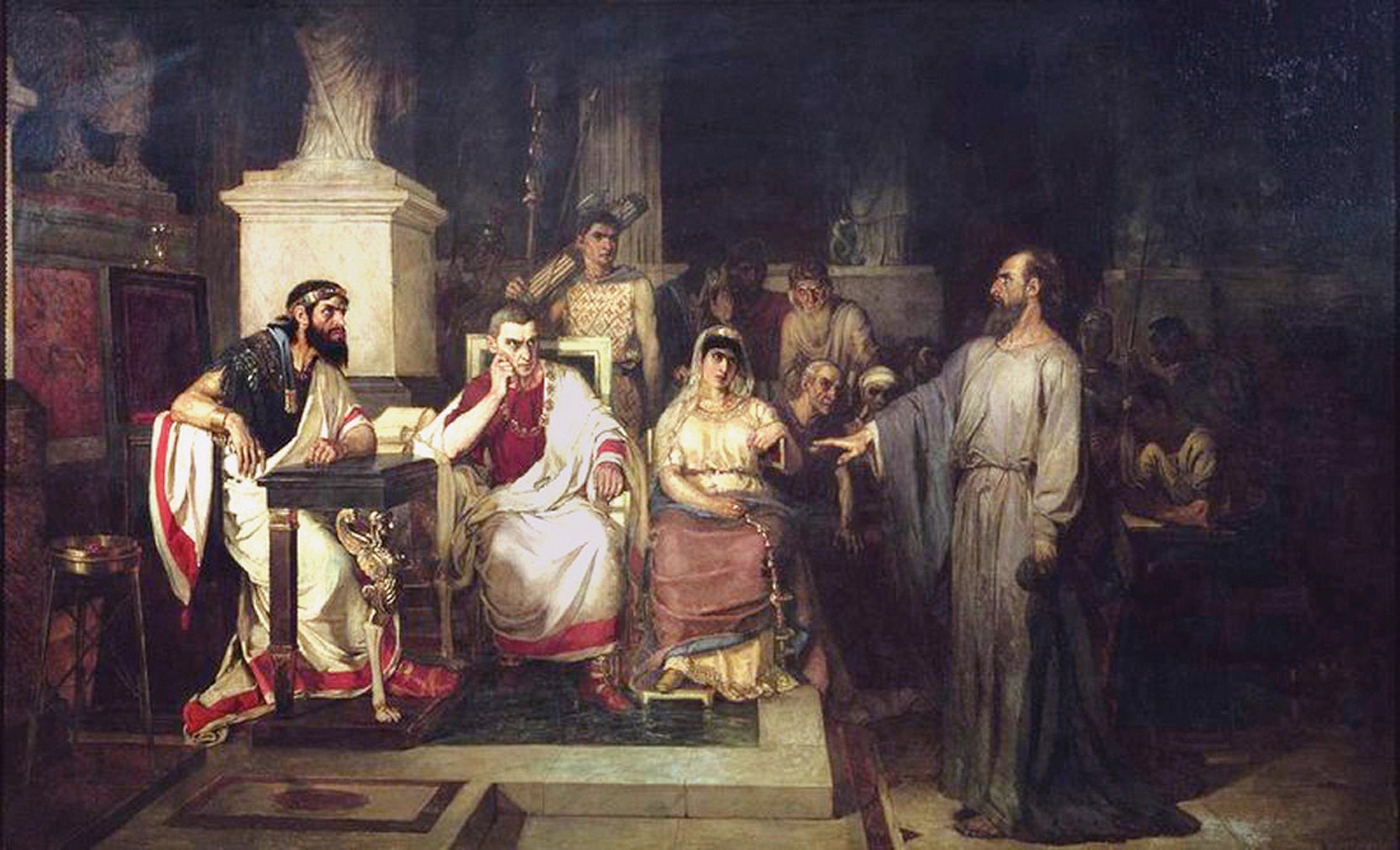 Со временем часть портретов, изображающих иностранных мастеров, была заменена на портреты новых русских композиторов (работ других художников). Особое место в творчестве Бодаревского занимает религиозная тема. Дипломная работа Бодаревского «Суд над Павлом» ("Павел у царя"):
