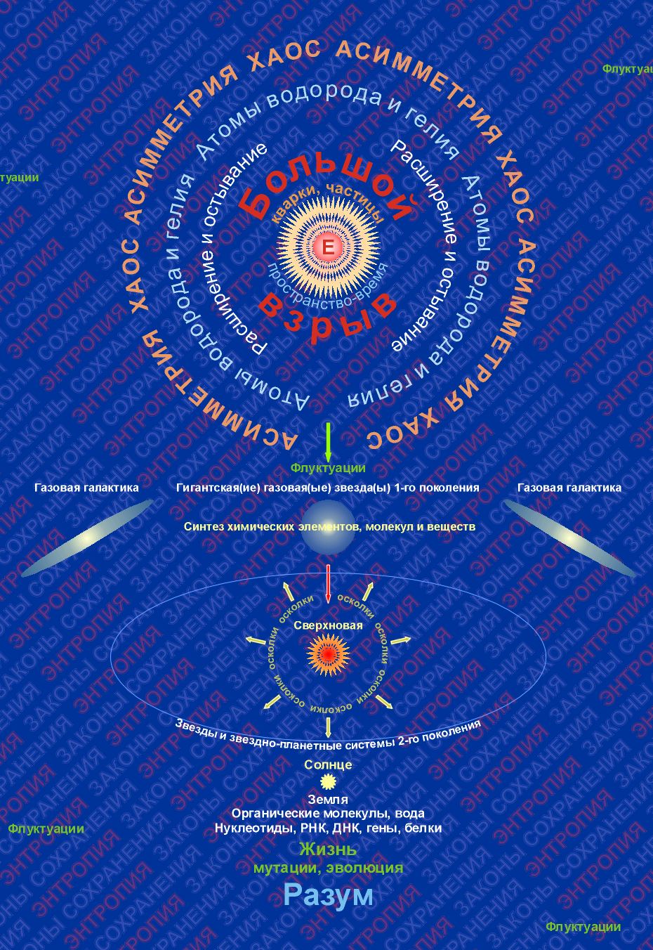 За счет главных законов природы материя имеет замечательное свойство самоорганизации. Природа предоставляет наблюдателю бесчисленные ее примеры: образование атомов из элементарных частиц, образование тяжелых элементов из легких в недрах звезд-гигантов, образование молекул из атомов или их ионов, образование кристаллических структур (простейший и нагляднейший пример - образование морозных узоров на окнах), образование регулярных природных полимеров и циклических структур, нуклеотидов, цепей РНК и ДНК и др. Практически все они объясняются "всего лишь" результатом действия четырех упомянутых выше фундаментальных взаимодействий между частицами микромира, атомами и молекулами. Все процессы самоорганизации постоянно находятся в неразрывном единстве действия указанных сил, законов сохранения, а также условиях практически непрерывного действия принципа достижения наиболее устойчивых (равновесных) состояний (см. Энтропия) и небольших, но исключительно важных исключений из него, - так называемых флуктуаций (соеобразных "турбулентностей" среды). Автором сайта построена такая схема последовательных и параллельных взаимосвязей в нашем мире: